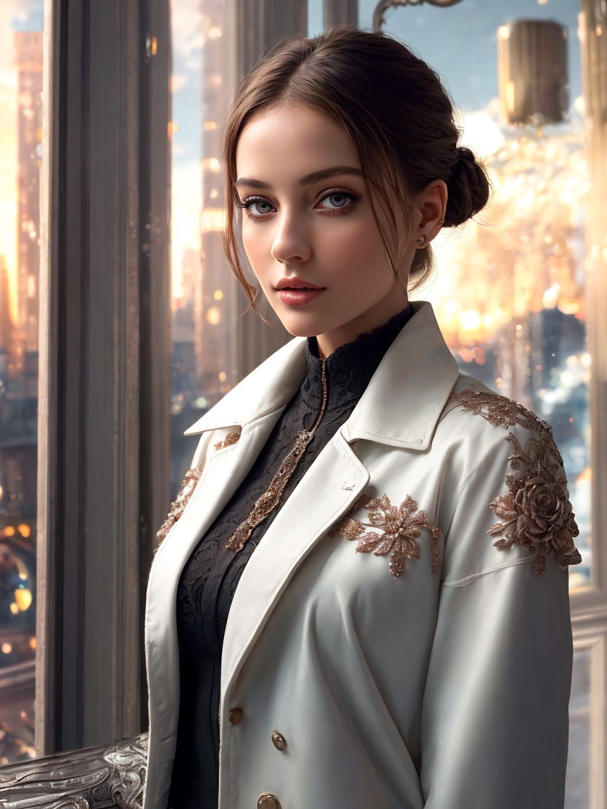 A young woman with an elegant hairstyle gazes intently, dressed in a sophisticated white coat adorned with floral embroidery. A fantastical cityscape glows softly in the background.
