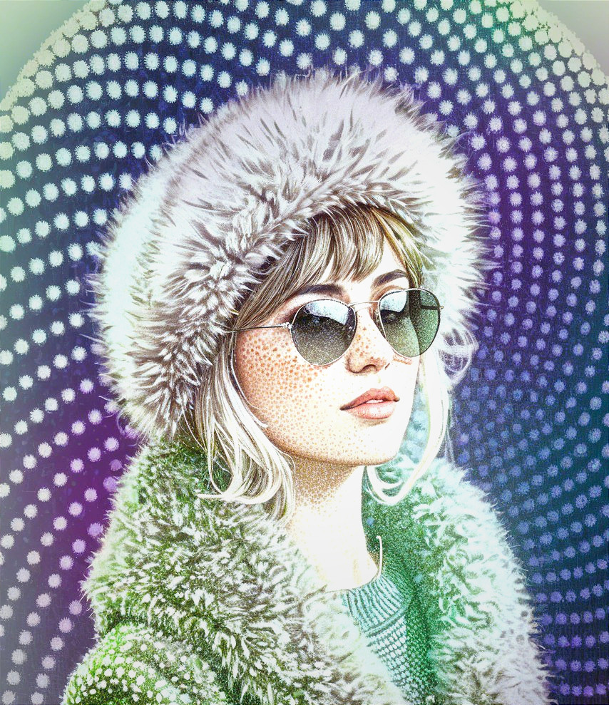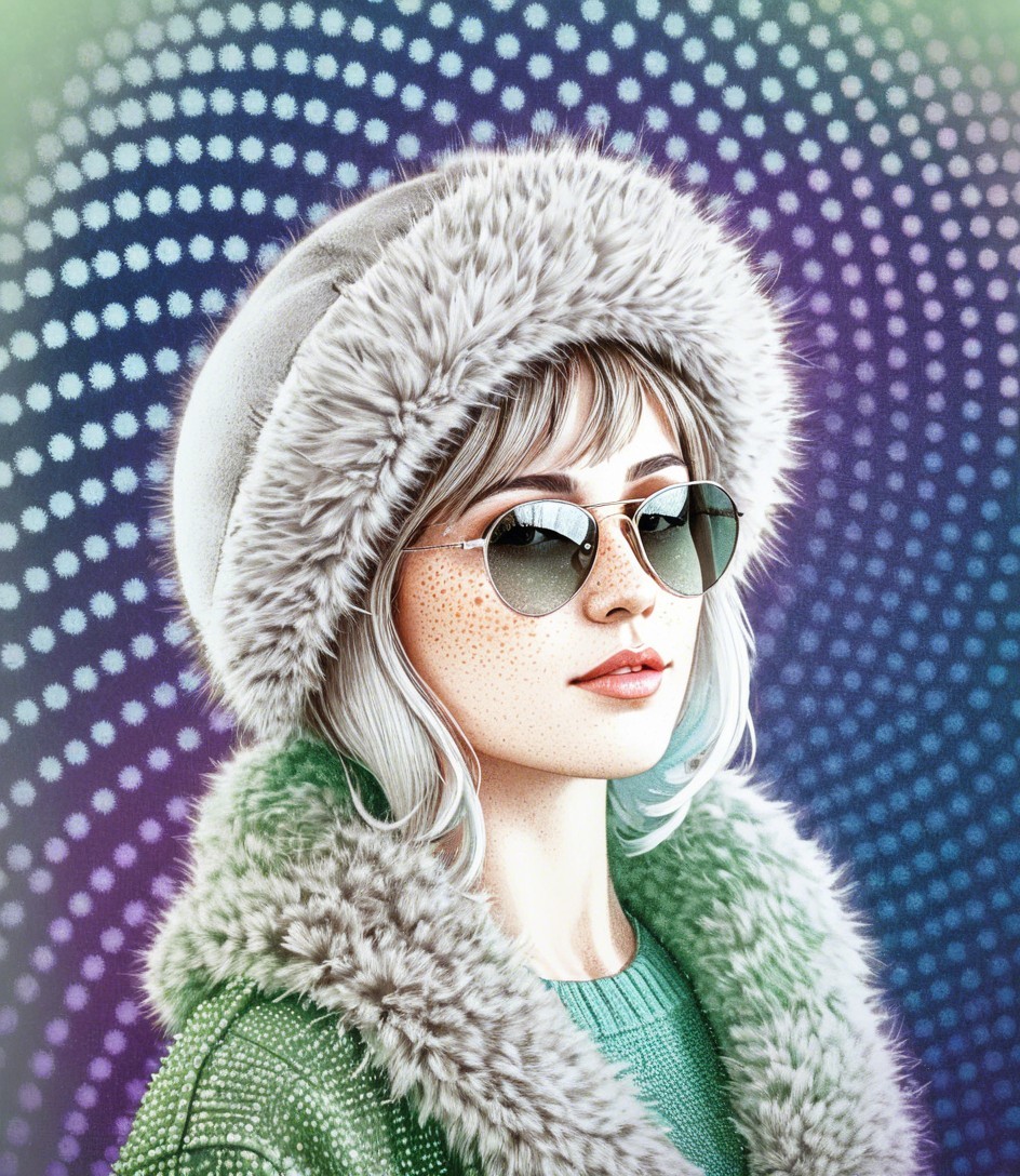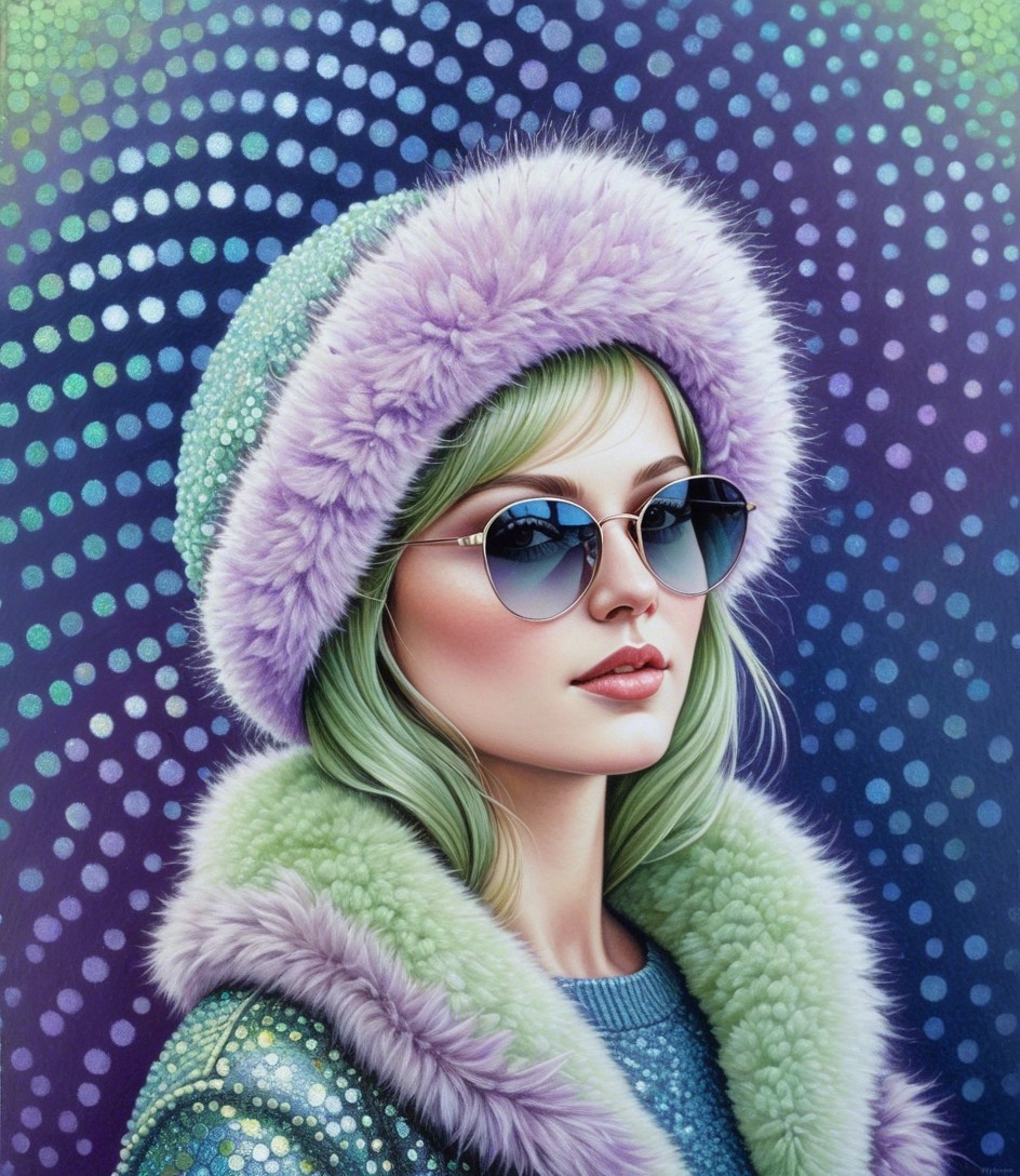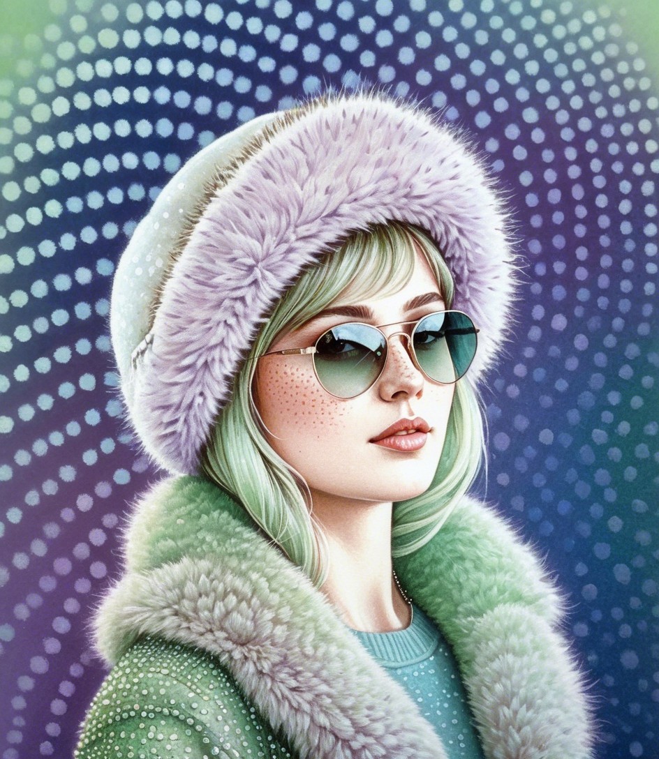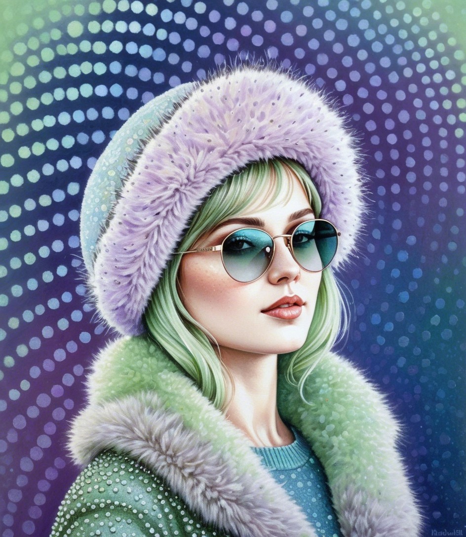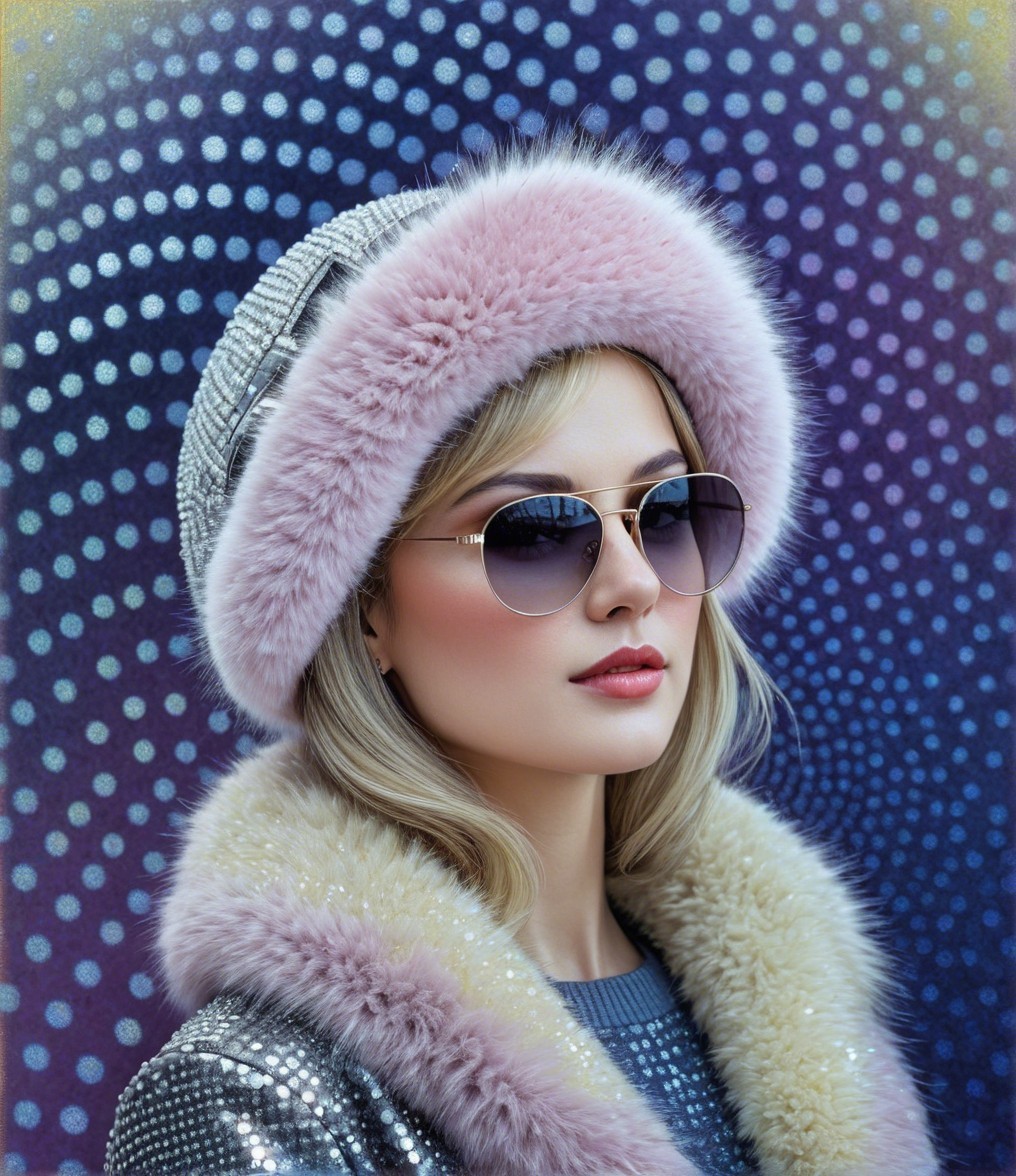 Upper body portrait, female heroine with sunglasses and furcap and fur coat emerging from background.Tiny dots in background, op art elements, pointillism details, soft eroticism, dreamy, metallic sparkling, magical, softened edges, dappled lighting, american gothic 1.7, anatomically correct, filigree patchwork, Pellucid, delicate shades of lavender and pale green, pastel tones of blue and grey, pointillism background in acrylic ink, soft pastel color palette, peaceful, only curves, hatching, tessellated style, tiny brush strokes, attractive, vector 9:5, dynamic lighting casting blurry shadows, dark, ominous atmosphere, reminiscent of Overton Loyd, unique aesthetic, otherworldly, alcoholic inkpunk 1.8, raytraced shadows 1.8, parallax occlusion 1.2, octane render illustration 1.5, subtle coloring 1.9, side view, stacked lines, squiggly line-art features, small reflections, shadws of blue, stylized, symmetrical, layered, multi-textured, precise Gelsculpt 64K, Novelty architecture, squiggly precision, traumacore 1.2, octane render illustration 1.5, comic book art, 1970s animated female fantasy character, deteriorated look, foampunk 1.4, serene face expression, shabby chic, modern cheerful surrealism features, overall composition by Georgia o'keffee and Overton Loyd and harrison fisher,