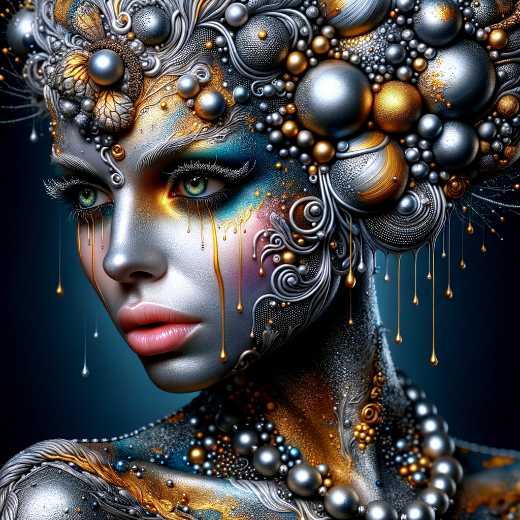 A mesmerizing portrait of a woman adorned with intricate metallic patterns and colorful embellishments, featuring shimmering pearls and vibrant hues against a dark background.