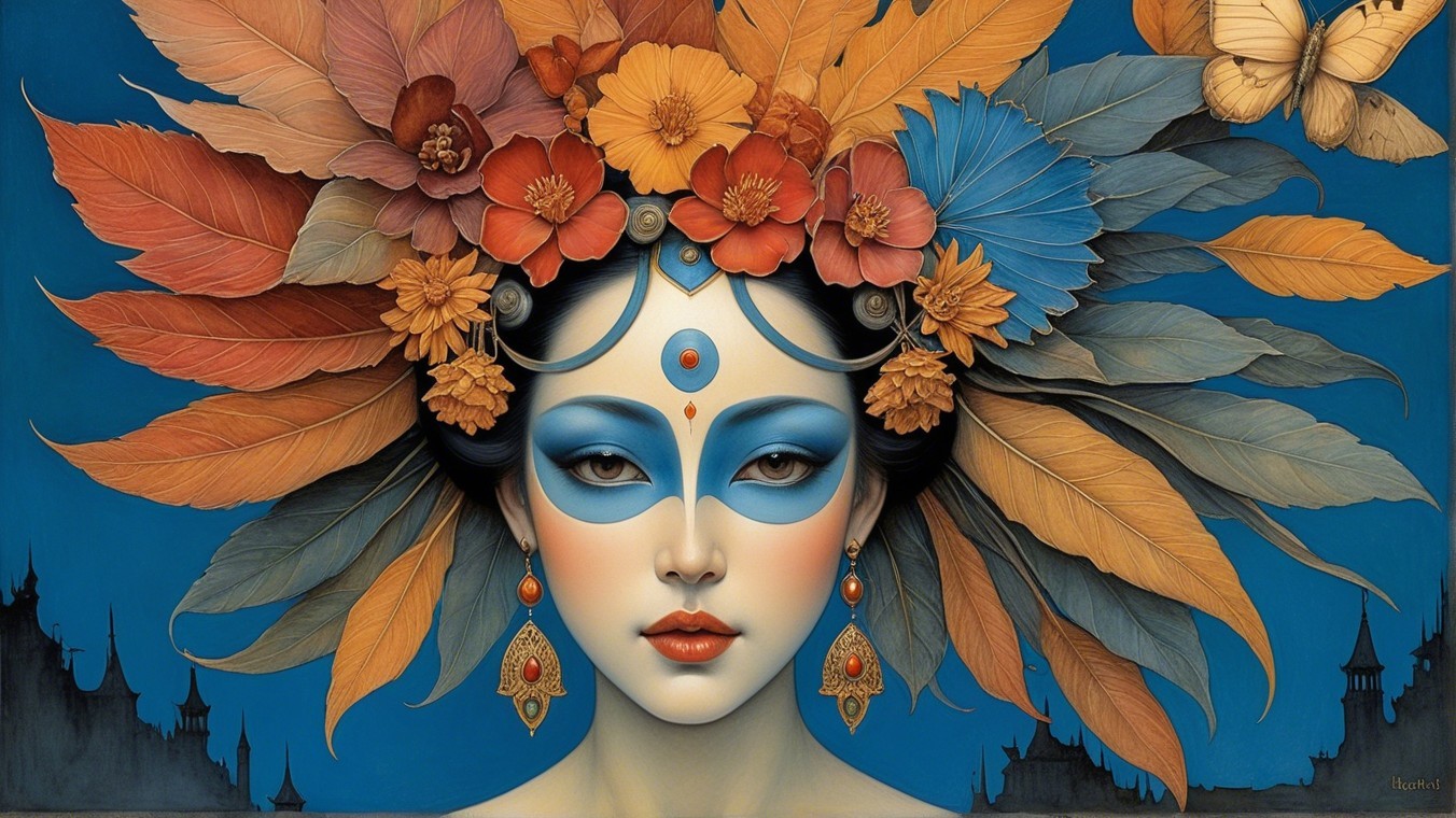 A serene portrait of a woman adorned with vibrant autumn leaves and flowers, featuring intricate jewelry. Her calm expression is enhanced by a backdrop of soft blue, evoking a sense of harmony.
