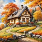 A charming thatched-roof cottage surrounded by vibrant autumn trees, with colorful leaves and a winding path leading to a serene lake, set against a backdrop of mountains in the distance.