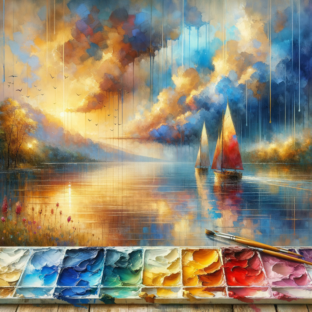 Prompt: Fading in the rain outside. More watercolor, gold and blues, more spring colors, sunset, watercolor patchwork. Mikalojus Ciurlionis. Andante. Sun Sonata. unique color palette. All this merges into a calm and peaceful landscape, where each element is in harmony with the others. oil on canvas in the style of Daniel Gerharz and Bernard Buffet.mixing but not shaking techniques