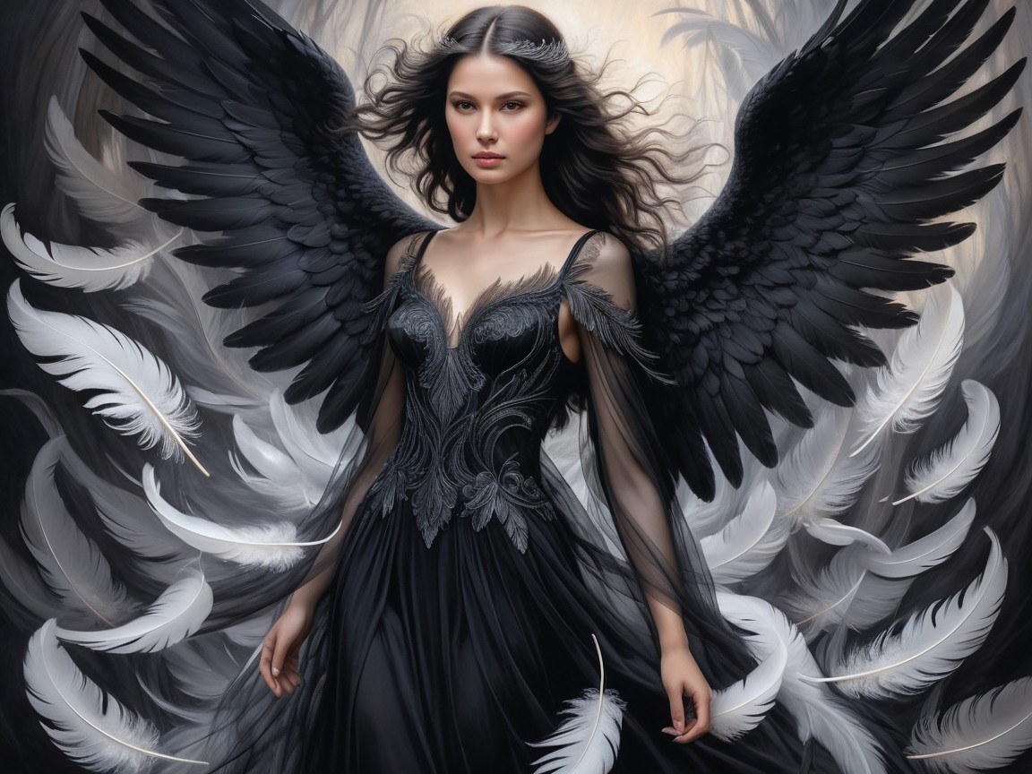 This artwork features a striking dark angel enveloped in a beautiful cascade of soft feathers, rendered in rich conte pastel. The contrast of light and shadow creates a captivating, ethereal presence.