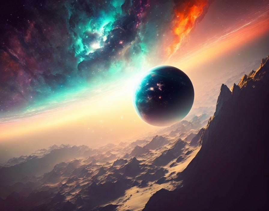 A vibrant cosmic scene with Earth, colorful auroras, clouds, and a distant planet against a starry backdrop.