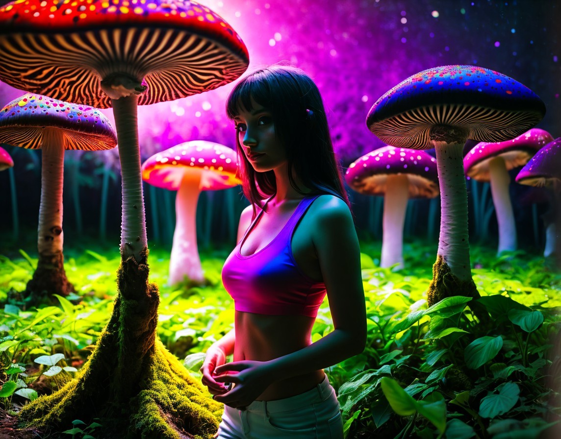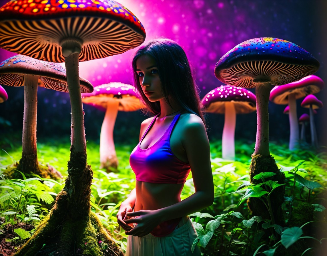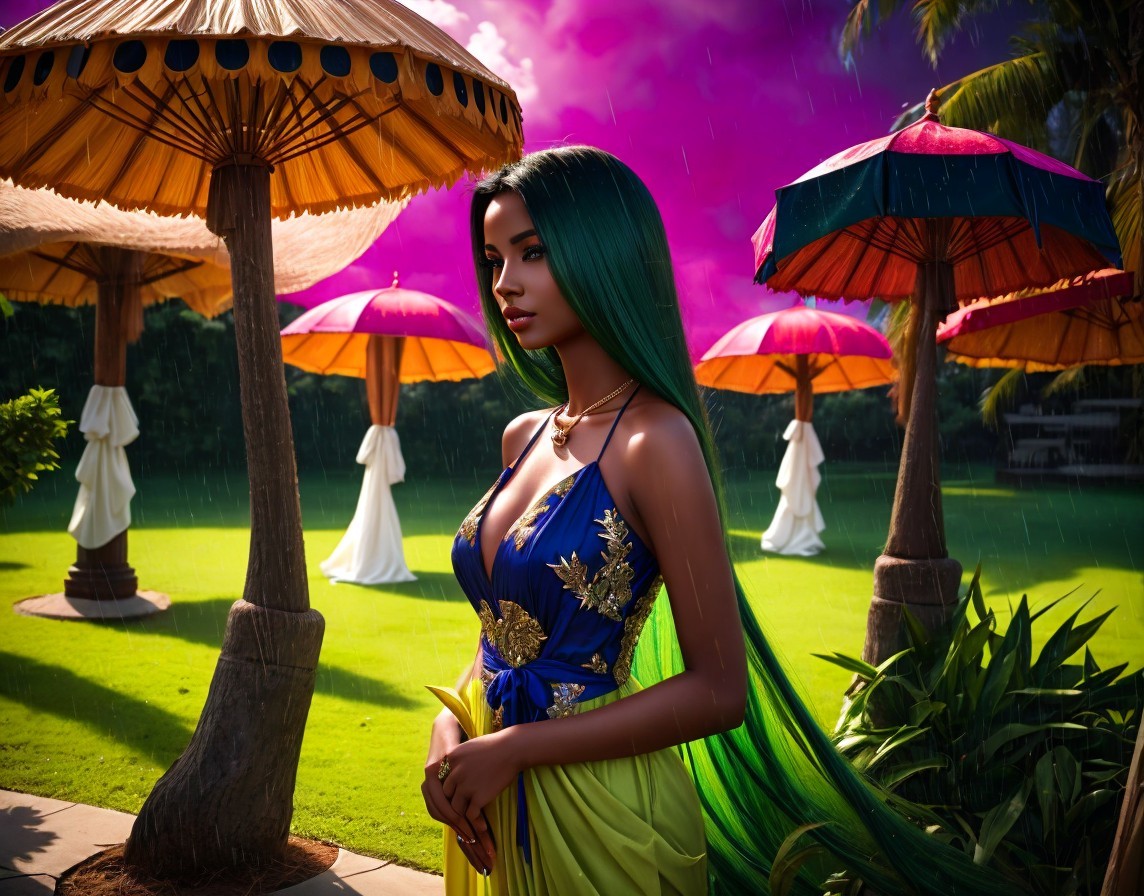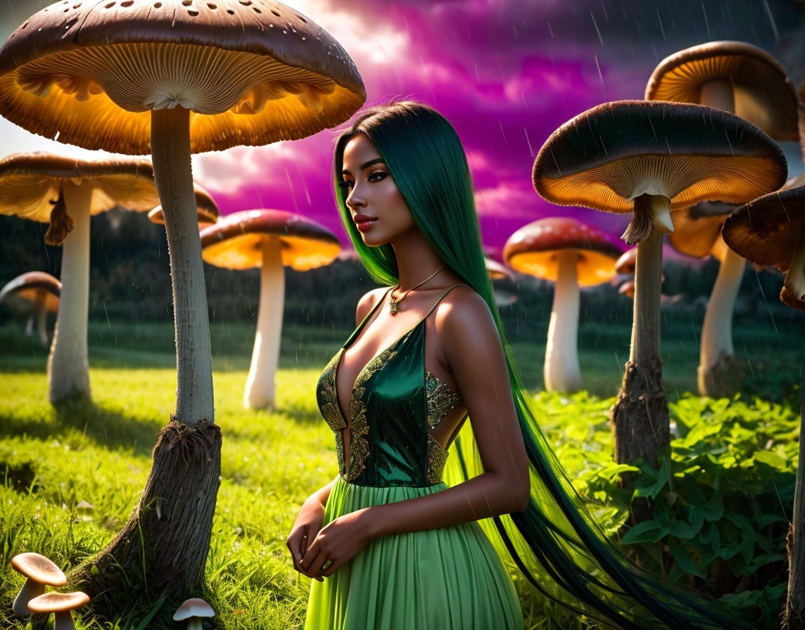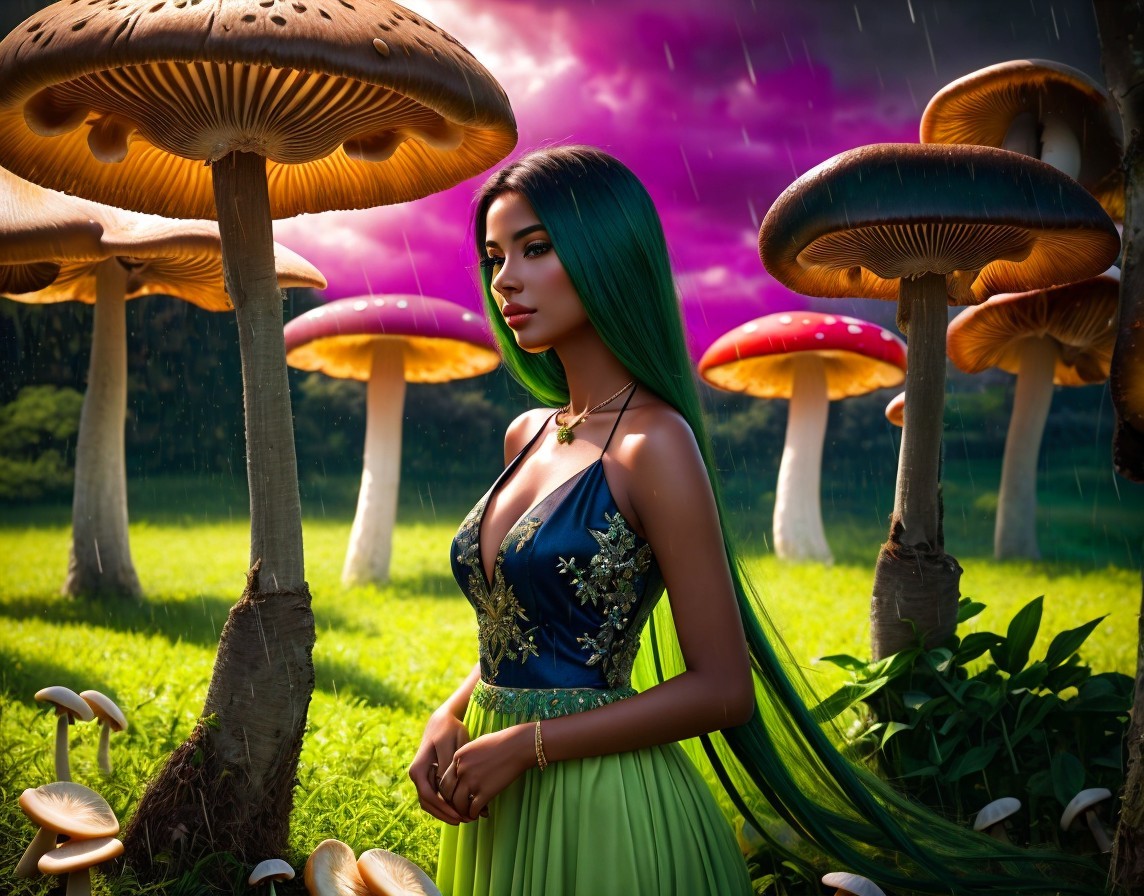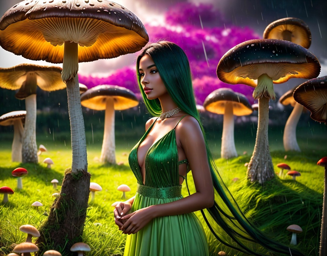 A woman with green hair in a vibrant forest with oversized mushrooms, amidst rain and purple foliage in the background.