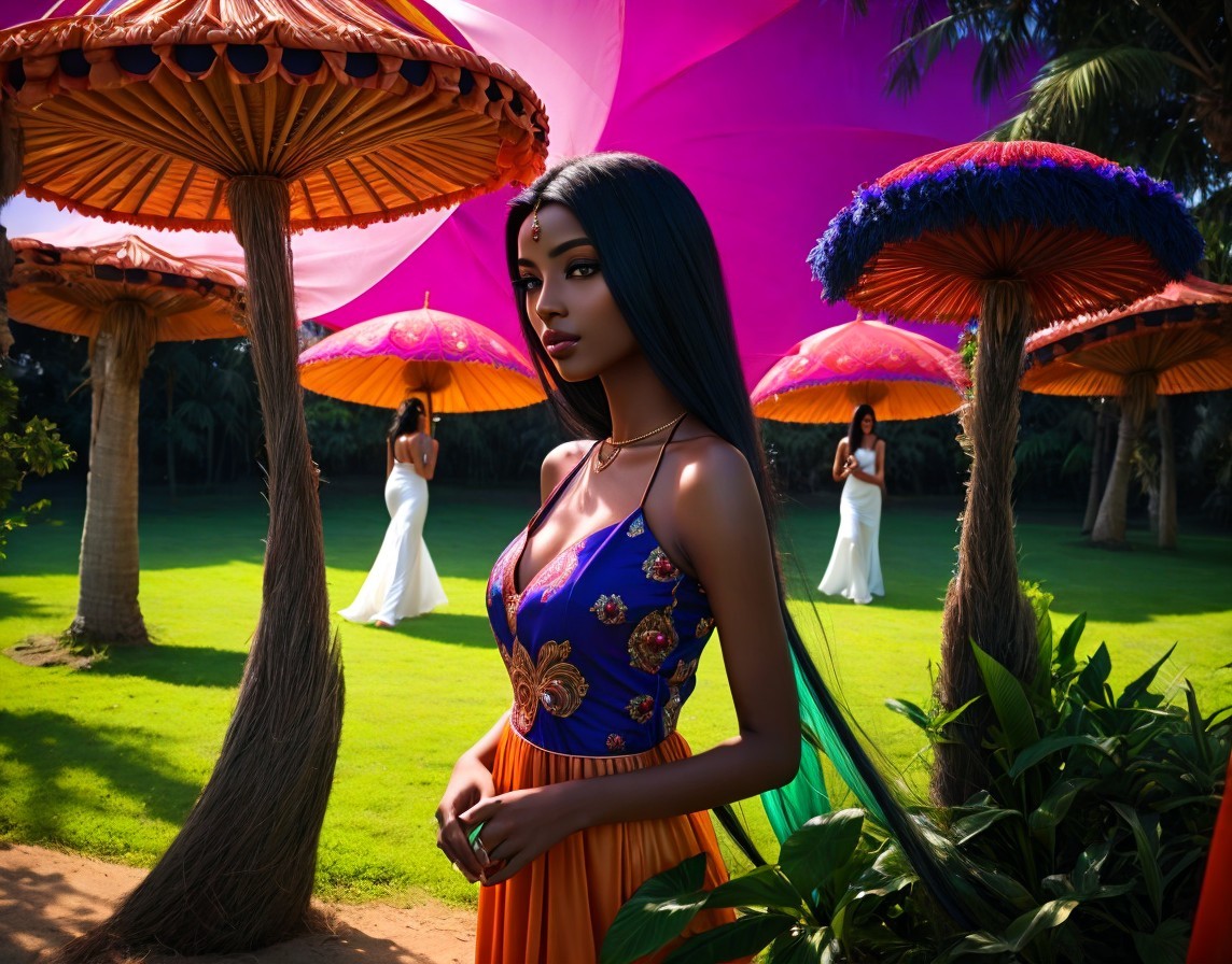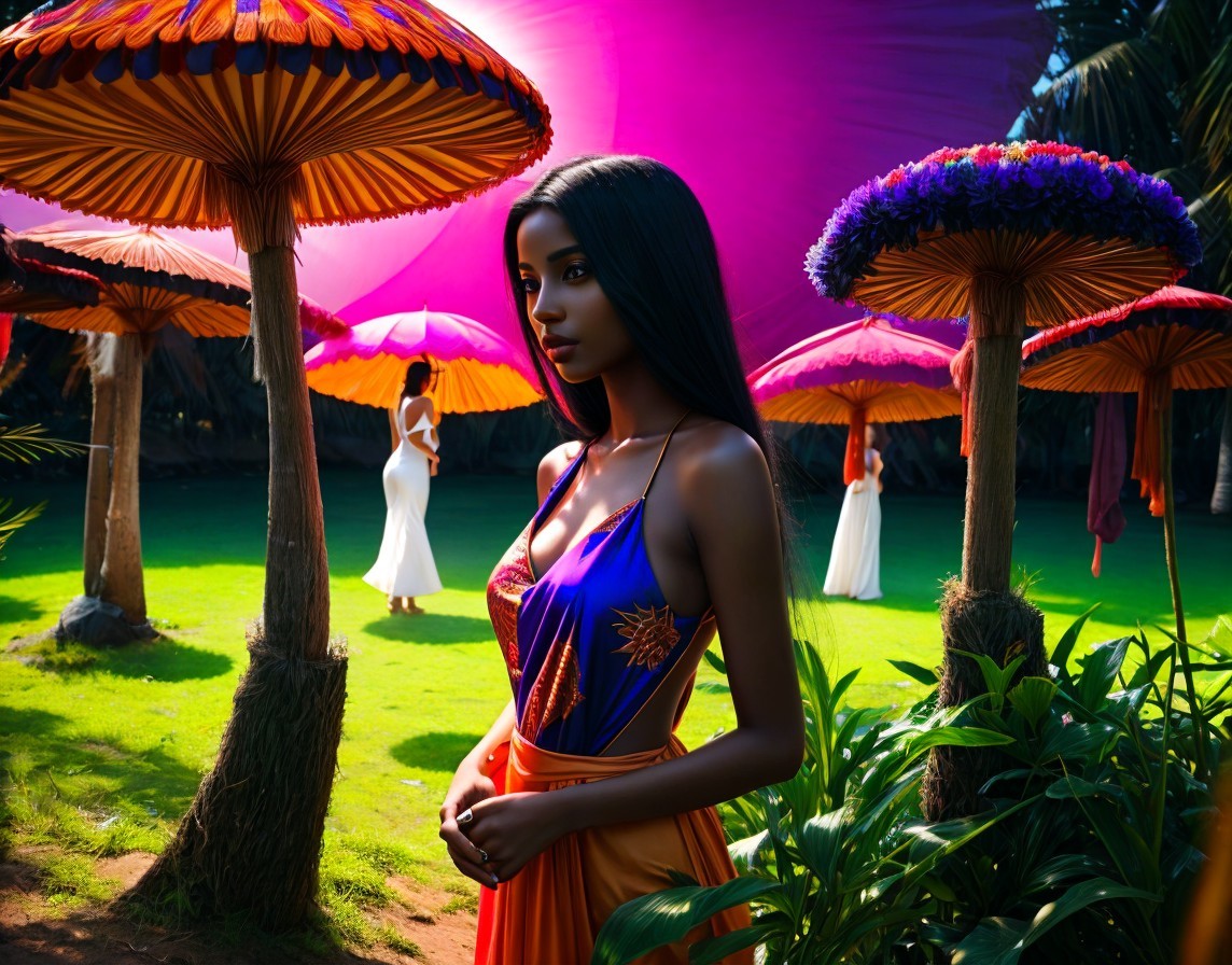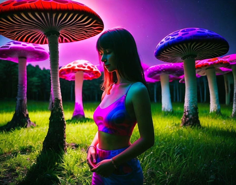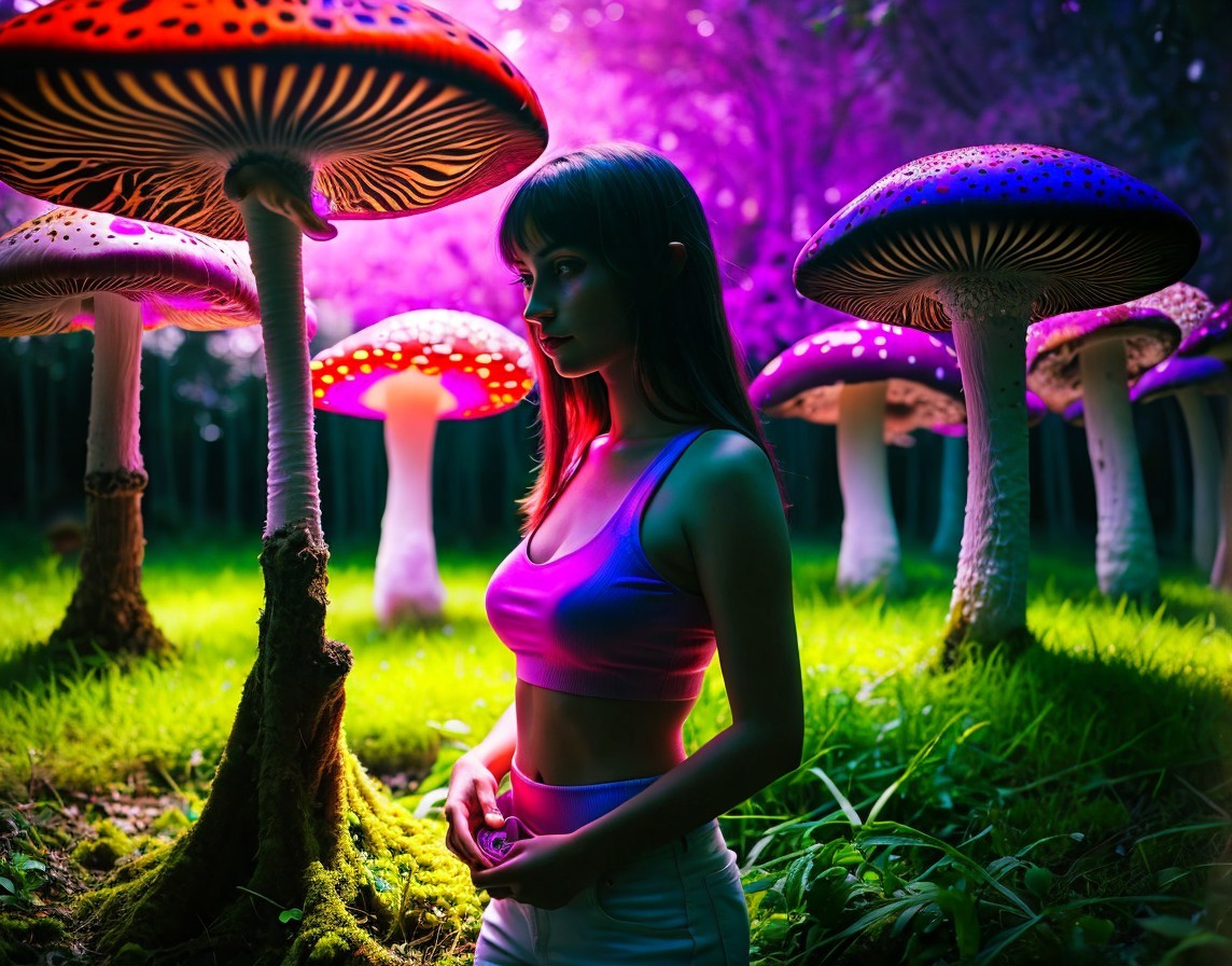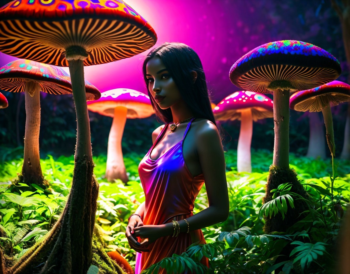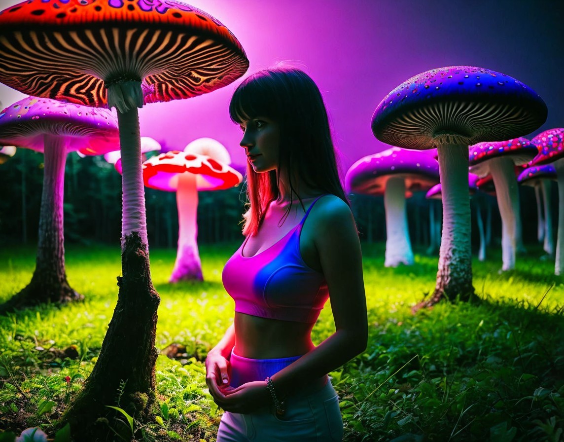 A woman with green hair in a vibrant forest with oversized mushrooms, amidst rain and purple foliage in the background.