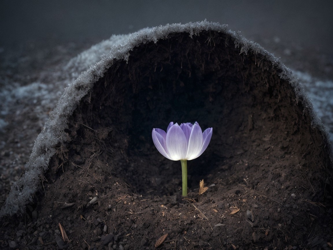 A purple crocus or tulip-like flower with white undersides on its petals, standing tall on a green stem, blooms out of dark brown soil in a dark arched cave-like structure composed of soil, with a layer of ice or snow along the top edge of the structure, and with more