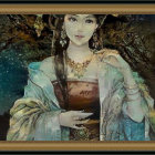 The painting features three raccoons peeking out from behind white trees, illuminated by a serene moon. A backdrop of dark trees and a glowing moon creates an enchanting atmosphere.