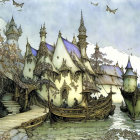 A tranquil scene depicts a sailboat on calm waters, surrounded by lush trees and colorful foliage. A serene sky with puffy clouds and a large moon adds a whimsical touch to the landscape.