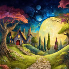 A whimsical landscape features a dark cottage surrounded by vibrant trees with pink leaves, under a glowing moon and starry sky. A winding path leads through lush greenery to the enchanting scene.