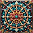 A vibrant, intricately designed mandala featuring layers of colorful petals and leaves in teal, gold, and deep red, set against a dark background, creating a harmonious, mesmerizing effect.