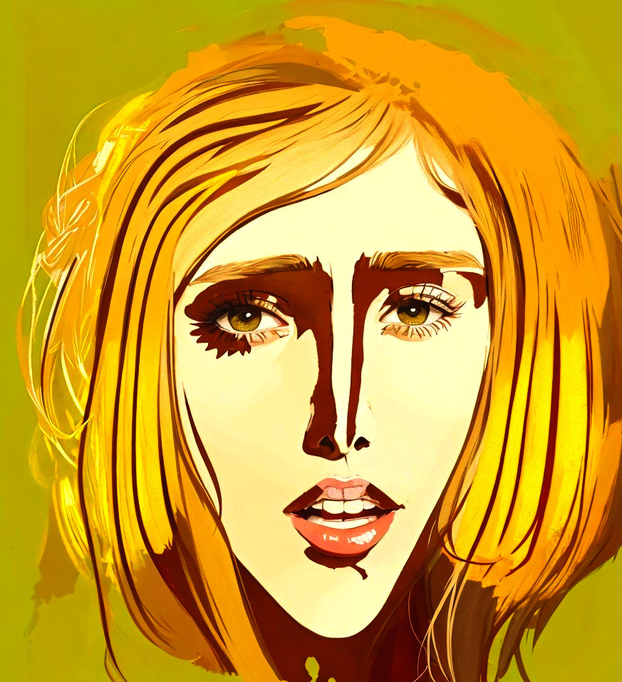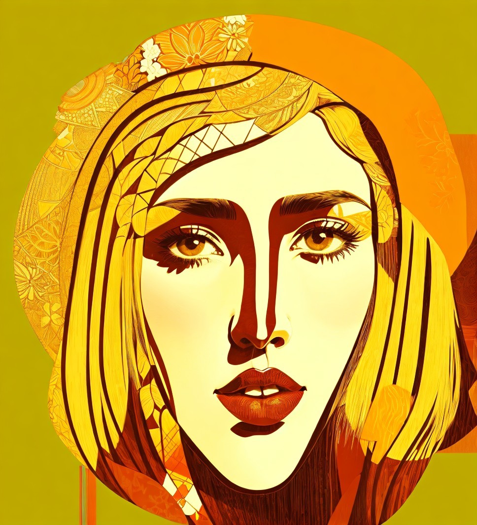 Stylized Portraiture, woodblock print, beautiful female face, orange lighting, geometrical illustrative style, maximalism, radiance, brightness 1.4, style of Alice Rudolf
