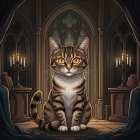 A full shot of a striped brown tabby cat with orange eyes, sitting upright on a wood altar in a large gothic cathedral, the cat looking directly at the viewer with a serious expression and its tail curled around its front paws, the cat's fluffy fur is brown with black stripes, and it has
