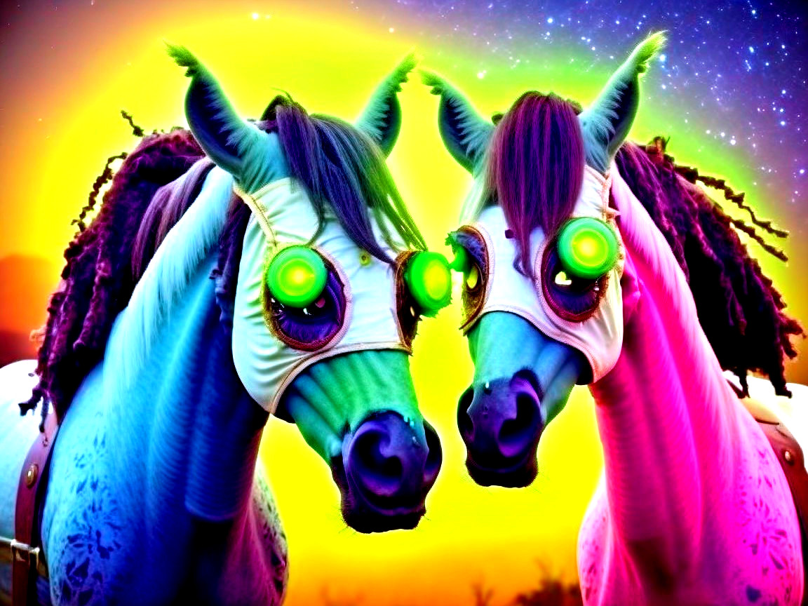 Two colorful horses, one blue with a green-striped face and purple mane and tail, and the other pink with a green-striped face and dark purple mane, wear white blinders with glowing green eyes and brass accents, set against an ethereal, rainbow gradient background of yellow, orange, and purple