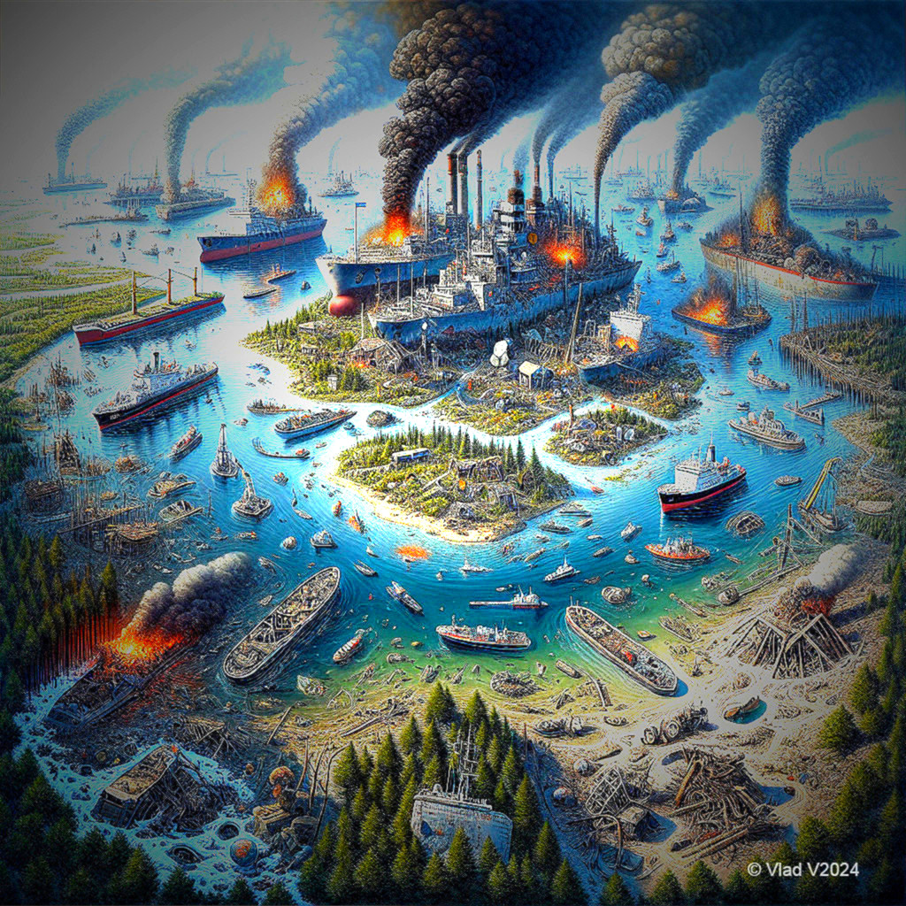 The image depicts a chaotic industrial scene with burning ships and factories, billowing smoke, and an environmentally devastated landscape, highlighting the consequences of pollution and neglect.