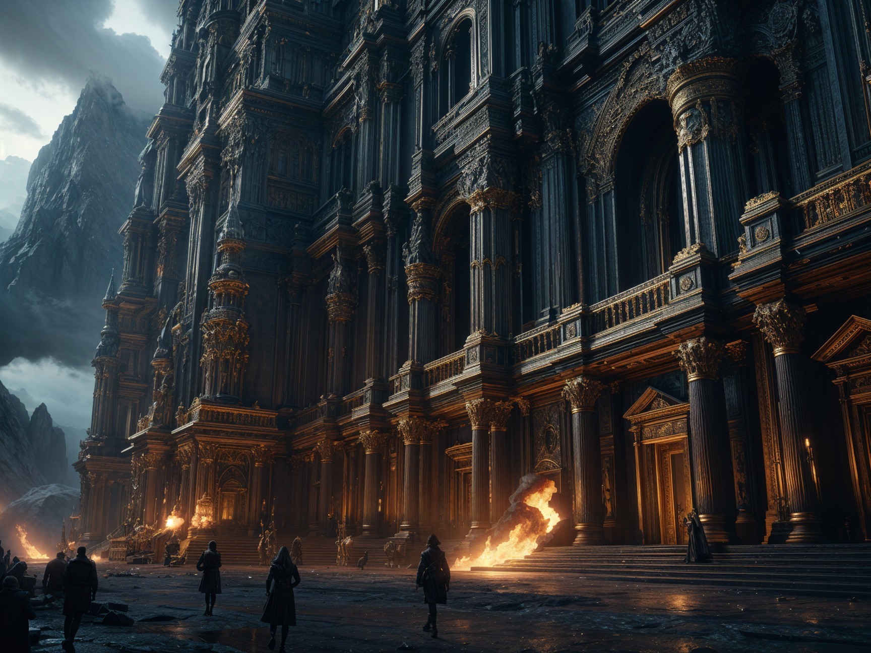 A grand, ornate structure rises majestically amidst a dramatic landscape of mountains and clouds. Illuminated by flickering lights, its intricate architecture evokes a sense of fantasy and mystery.