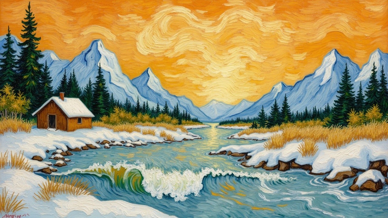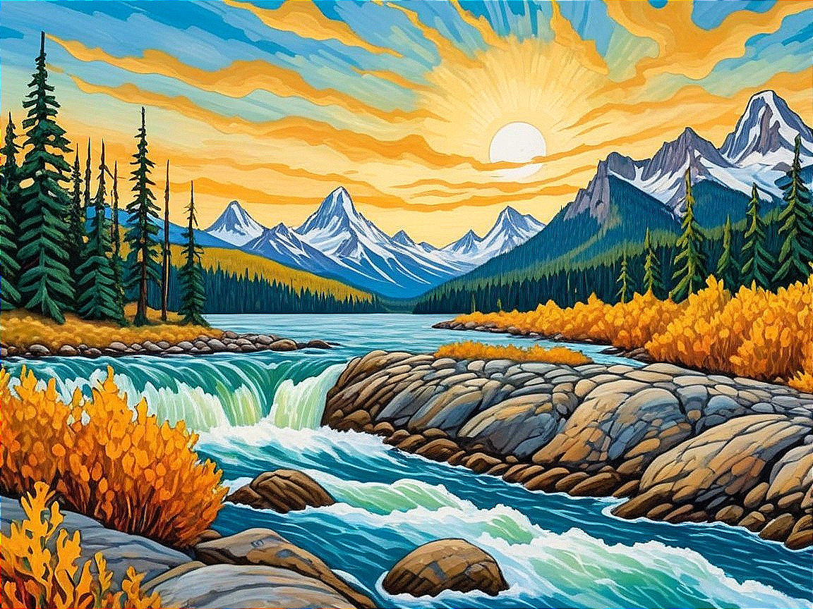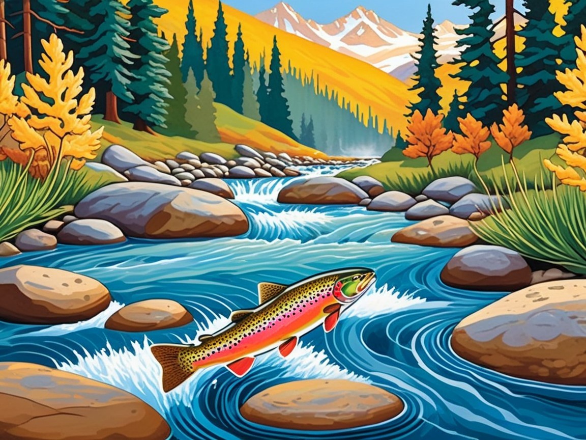A vibrant trout leaps from a clear, rushing river surrounded by lush green trees and rocky terrain. Mountains loom in the background, creating a picturesque nature scene.