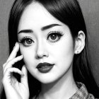 A striking black-and-white portrait of a woman in a cityscape backdrop. She applies dark lipstick, showcasing bold makeup and elegant features, exuding confidence and sophistication.