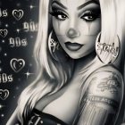 A glamorous woman with long blonde hair and bold makeup poses confidently. She wears a choker and a stylish outfit, with a baseball and camera in the background, exuding a striking vibe.