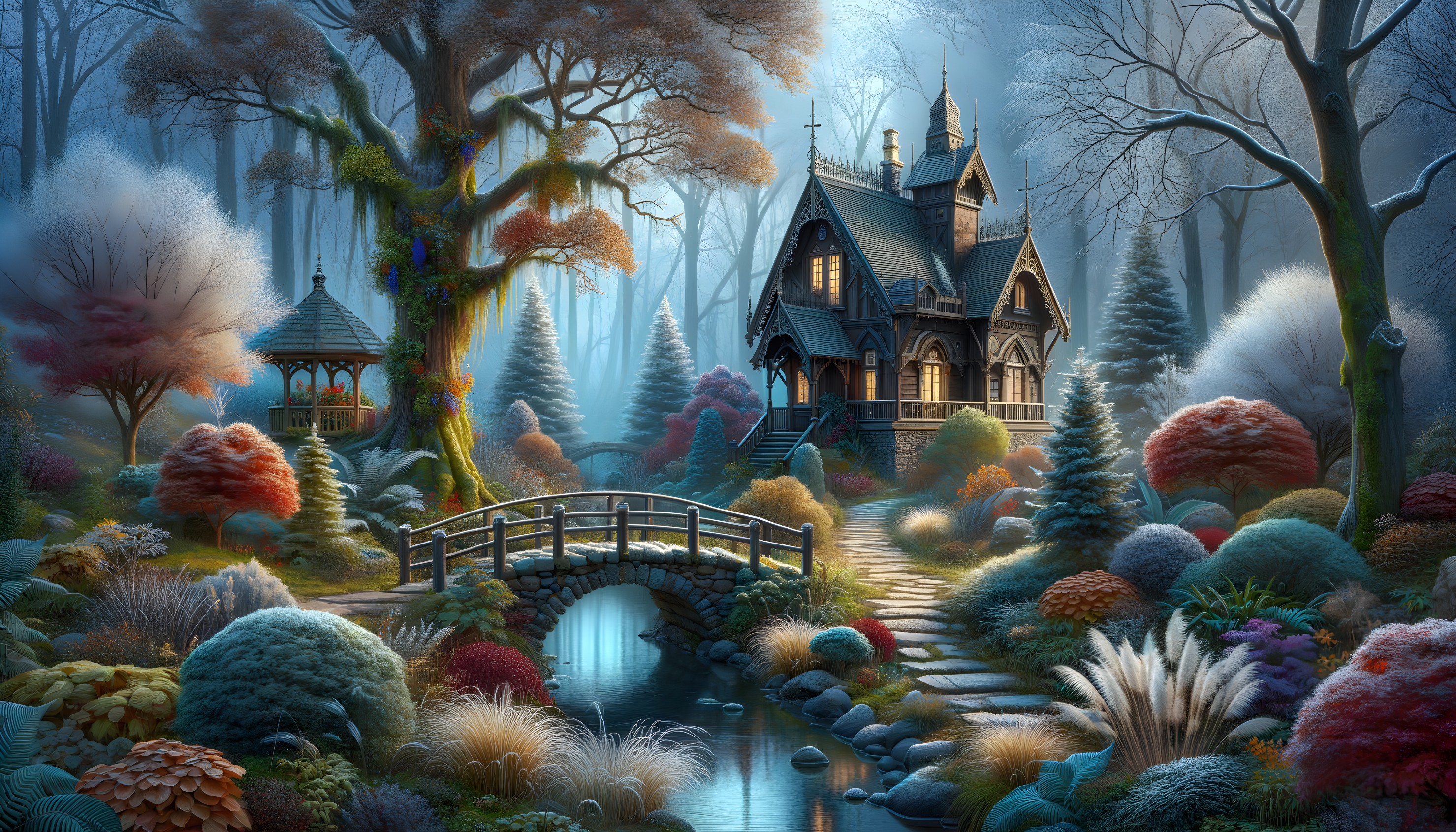 A whimsical cottage amidst a vibrant, lush garden with a bridge over a stream, surrounded by fantastical trees and foliage in a dreamy forest.