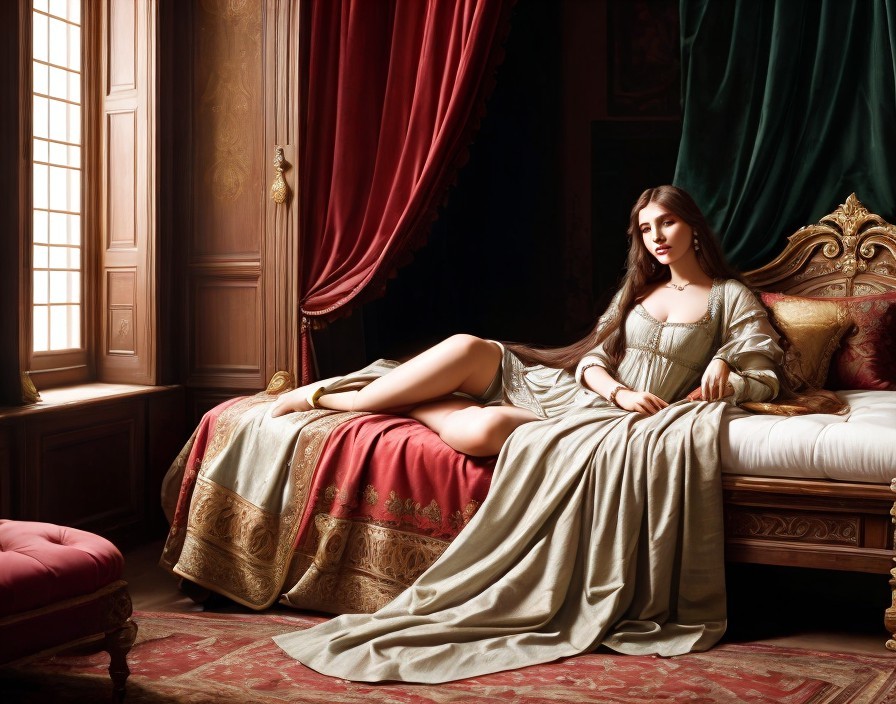 A digital artwork of a woman lounging regally on a luxurious bed in a richly decorated room with heavy drapery and classic furniture.