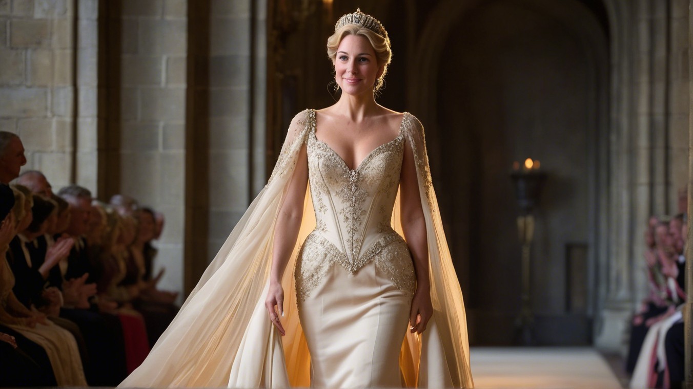 A regal figure in a stunning gold-accented gown walks confidently down a medieval hall, surrounded by onlookers in elegant attire, illuminated by candlelight. A scene of elegance and authority.