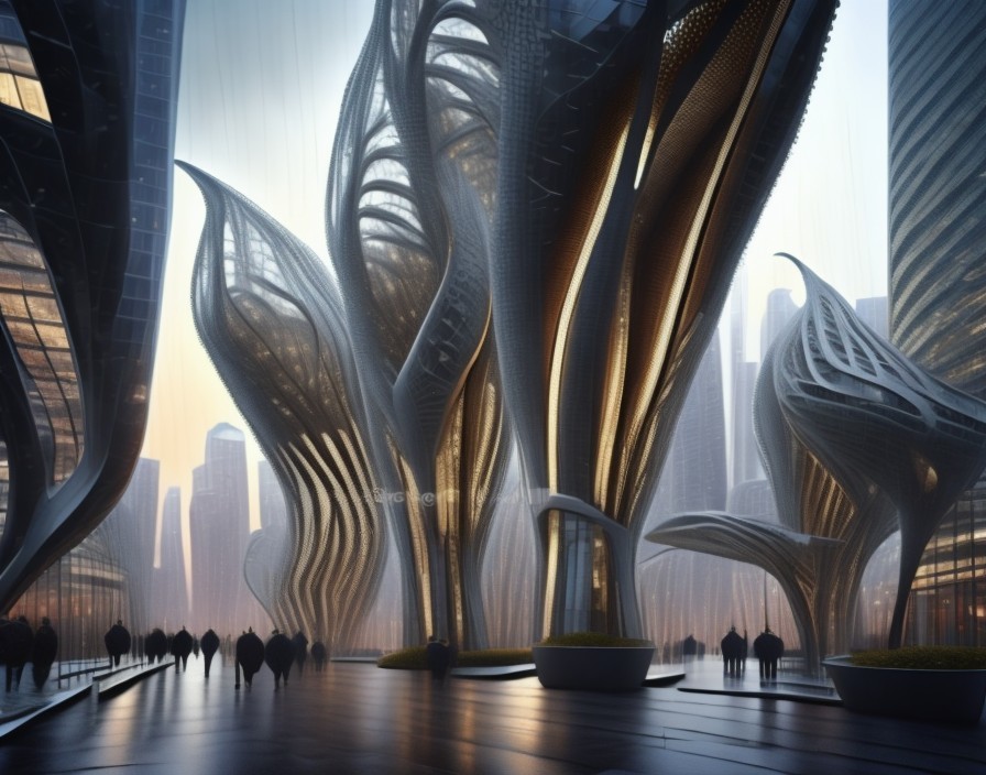 A futuristic interior with organic, sweeping structures and people walking under a soft-lit sky.