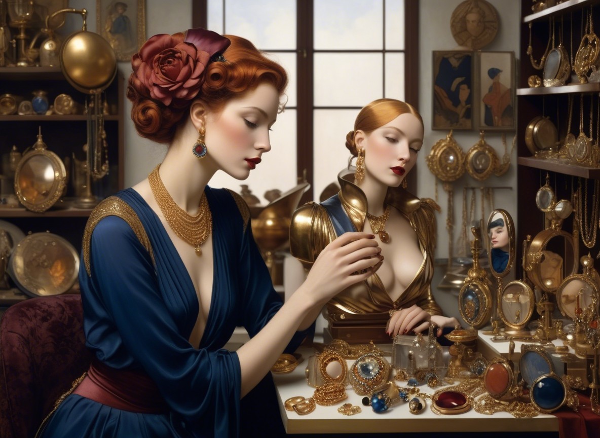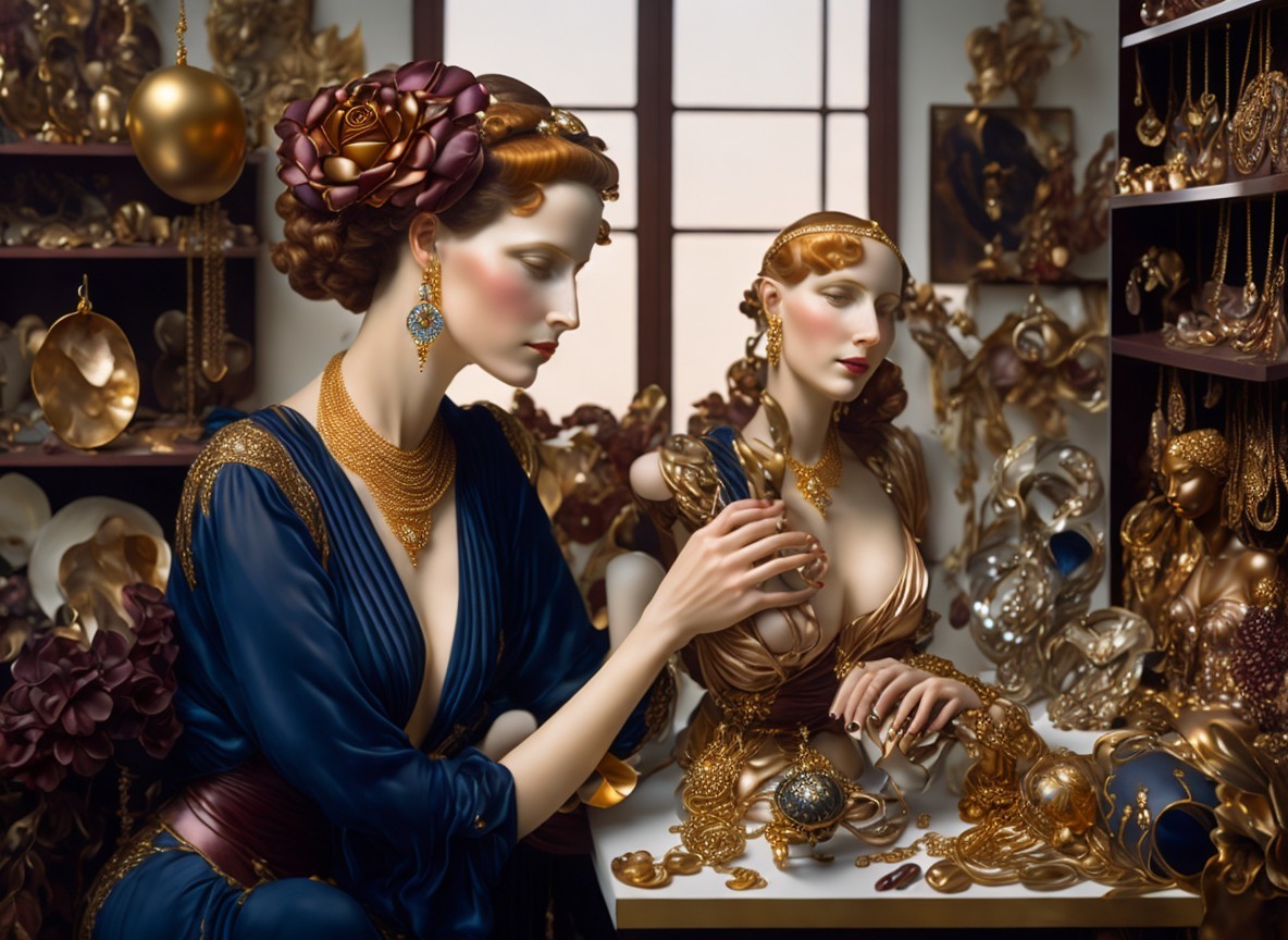 Two elegantly dressed women examine ornate jewelry in a vintage shop. Rich colors and intricate designs surround them, highlighting their refined style amidst a backdrop of golden treasures.