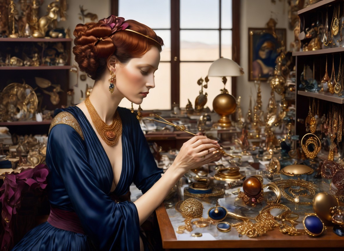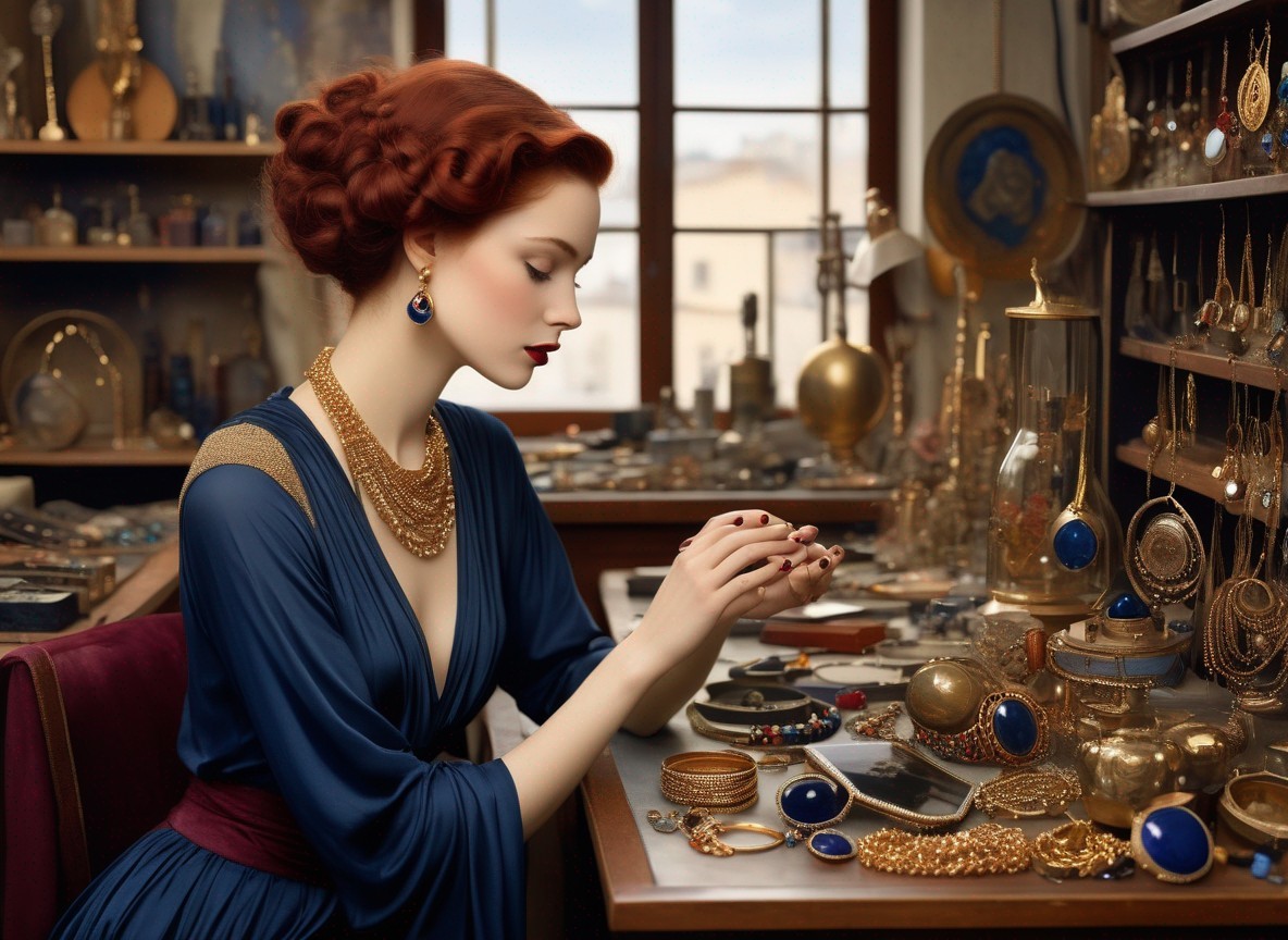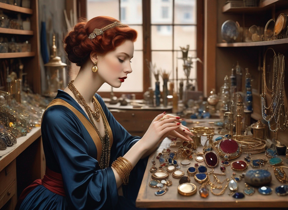 Prompt: Beautiful woman in her jewelry studio, in the style of michael parkes. in the style of WALTER MARTIN BAUMHOFER and rené gruau