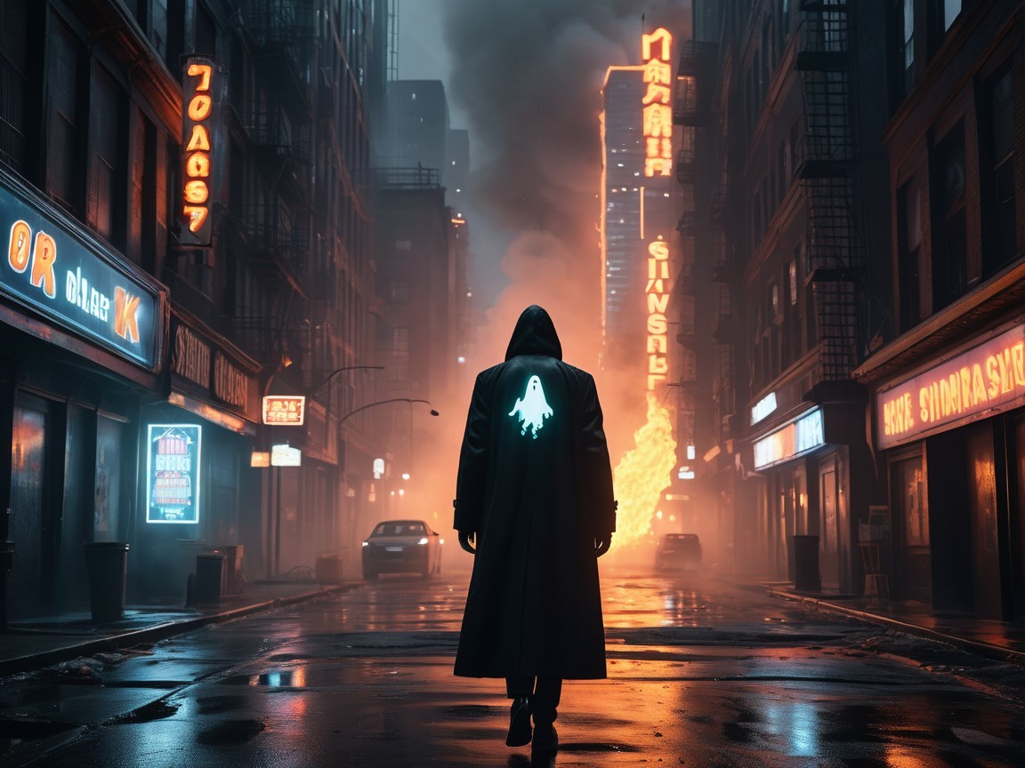A mysterious figure in a dark cloak stands in a foggy, neon-lit cityscape. The urban streets are dim, with glowing signs illuminating the eerie atmosphere. Shadows of pedestrians loom in the background.