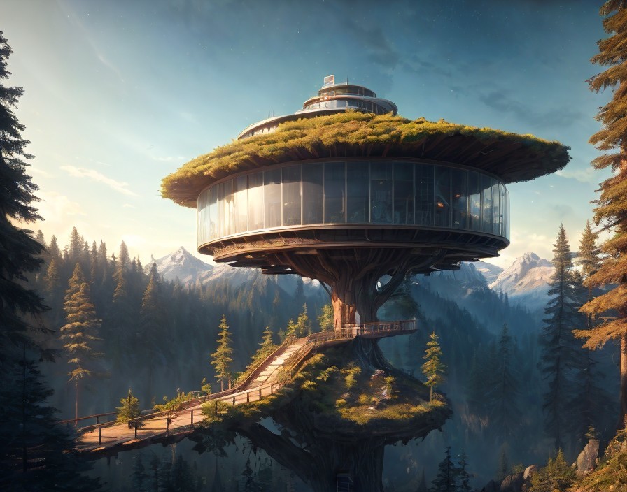 Glass-domed futuristic treehouse on large tree in forest with wooden bridge and mountain views
