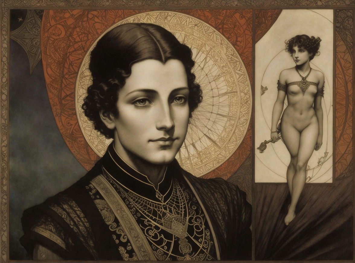 The image features a portrait of a young woman in elegant attire, framed by intricate designs. She gazes confidently, with a mysterious, historical background highlighting her beauty and poise.