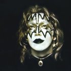 A person with striking, dramatic face paint featuring black and blue designs, dressed in a black outfit. The contrast creates an impactful and intense visual presence against a dark background.