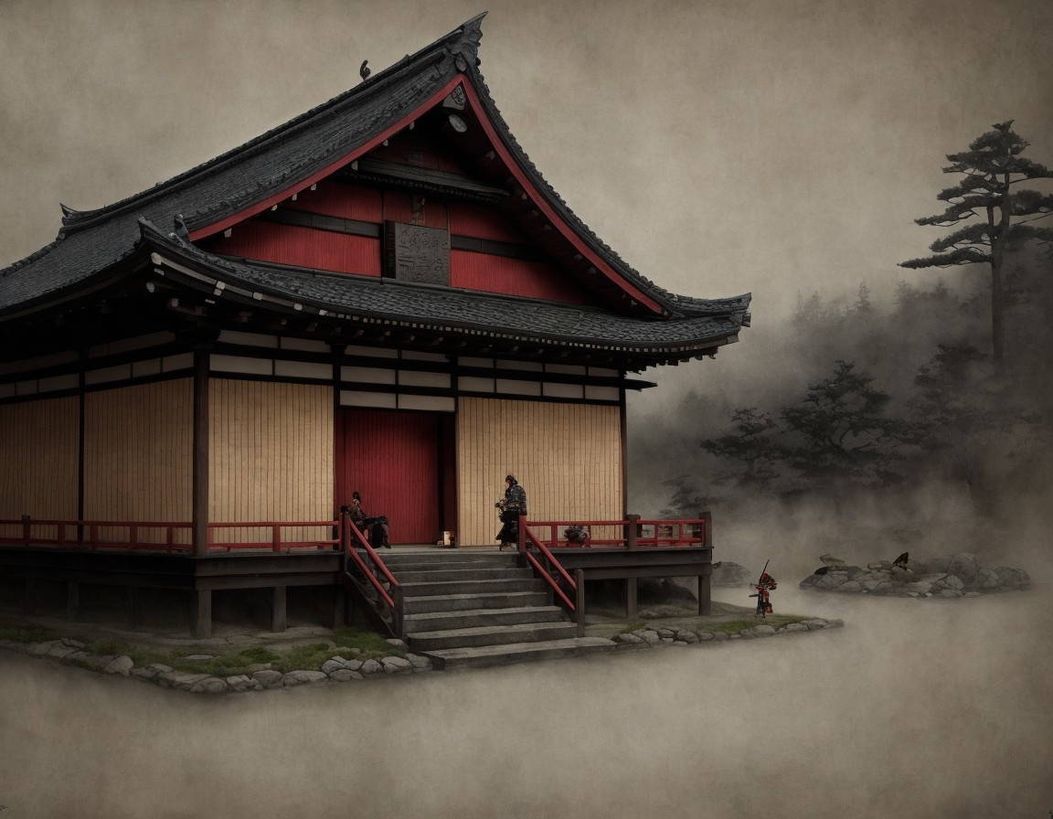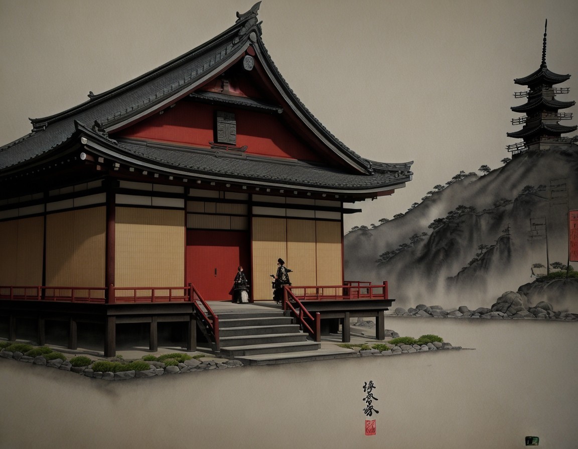 Two individuals in traditional attire stand before a historic Japanese red building with a pagoda and misty Mount Fuji in the background.