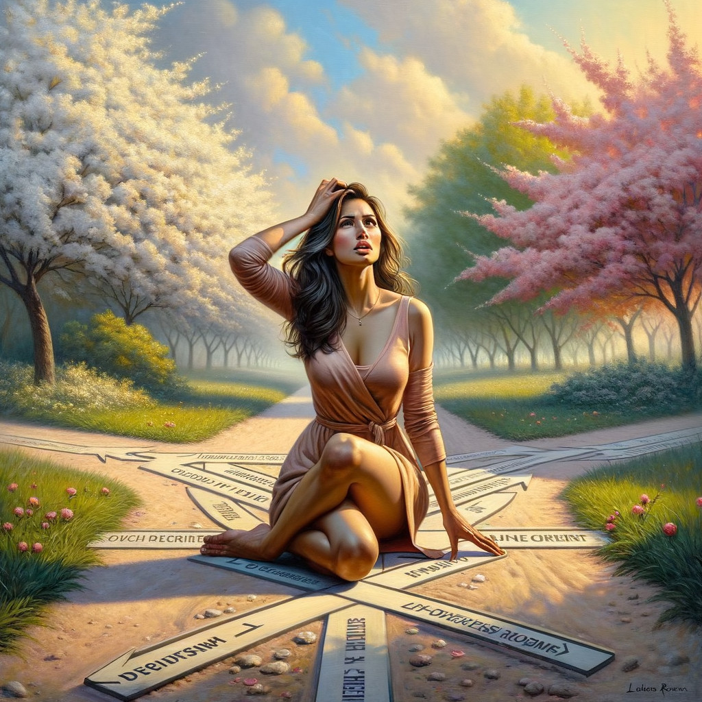 A thoughtful woman kneels at a crossroads surrounded by blossoming trees, contemplating her path in a serene, colorful landscape bathed in soft, warm light.