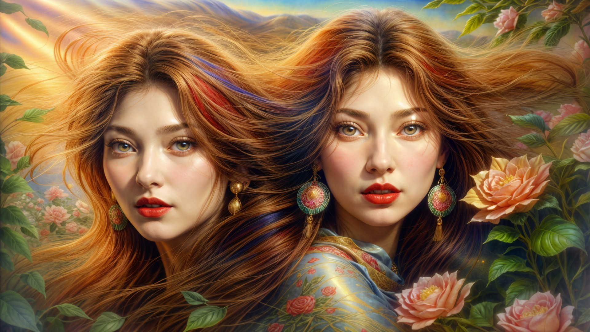 The image features a serene young woman with flowing red hair, adorned with delicate facial features. She is surrounded by vibrant floral patterns, adding a whimsical touch to the scene.