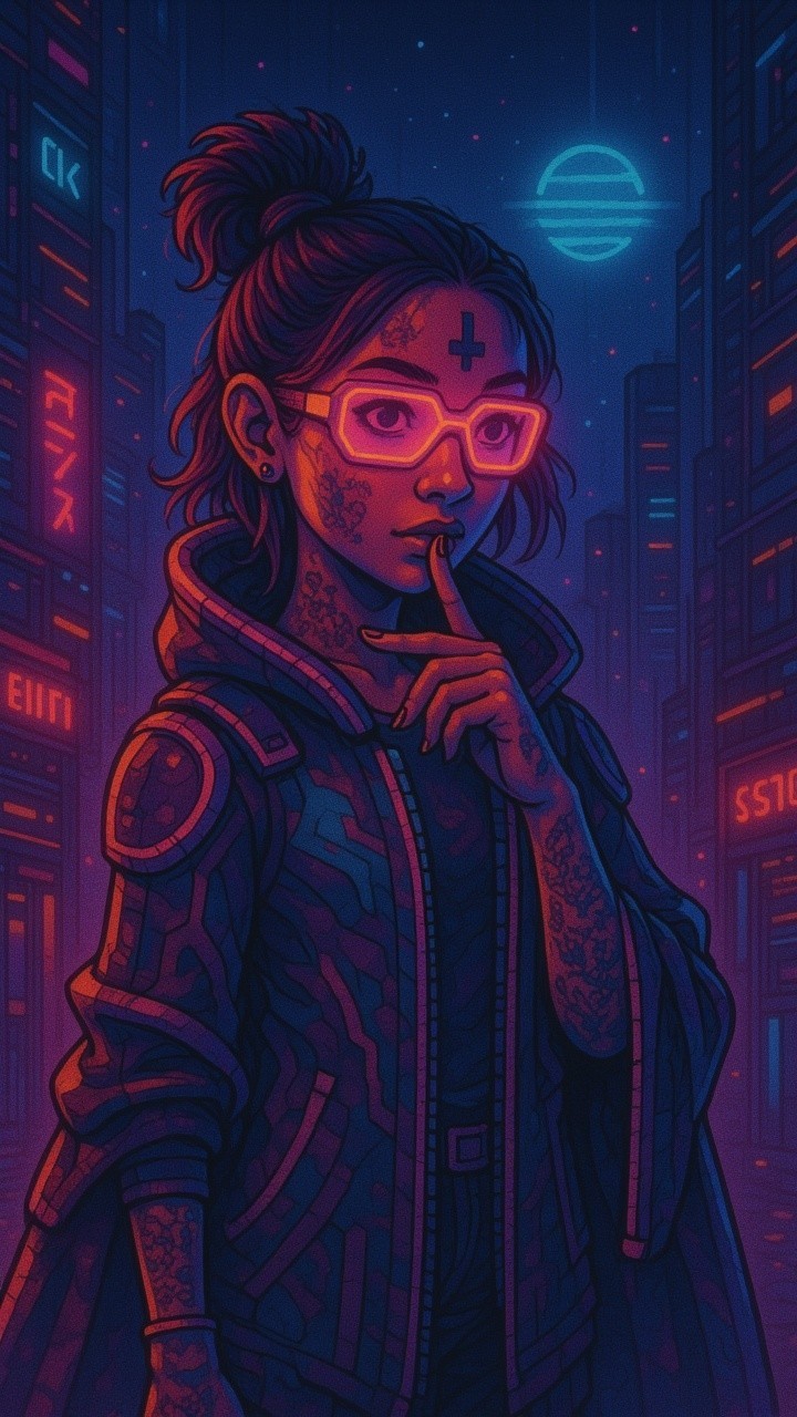 A vibrant, futuristic scene features a young woman with colorful tattoos and glasses, dressed in a stylish jacket, set against a backdrop of neon-lit city streets and glowing signs.