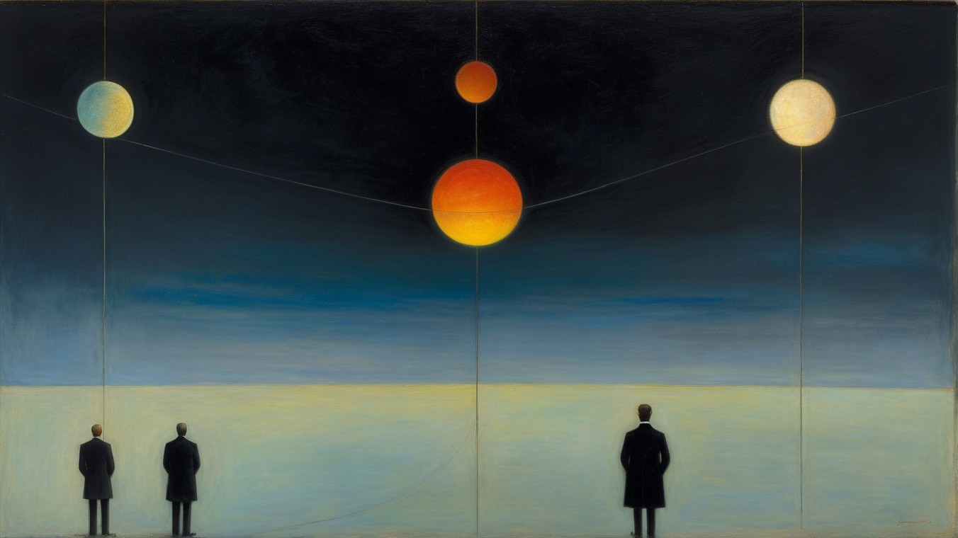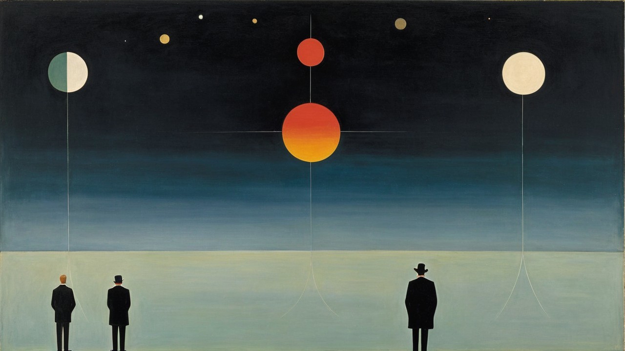 The artwork features two figures in dark coats gazing at a surreal celestial landscape, with colorful planets and a gradient sky, evoking a sense of wonder and cosmic contemplation.