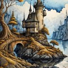 A monochrome scene features a young woman in a traditional dress, holding a letter, with a punkoïd castle in the background, set amidst hard mountains and a reflective lake.