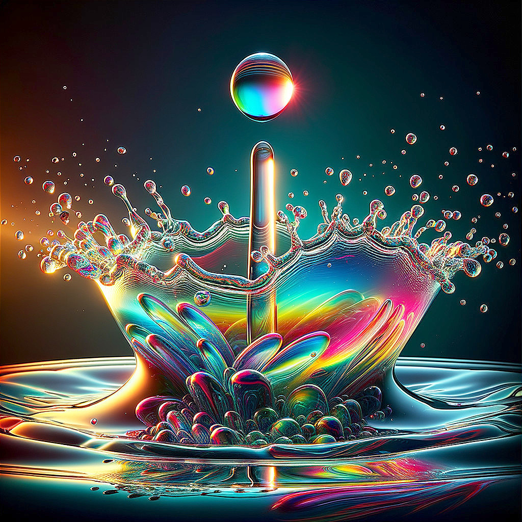 A vibrant, colorful digital artwork of a liquid splash with iridescent bubbles and a droplet suspended above.