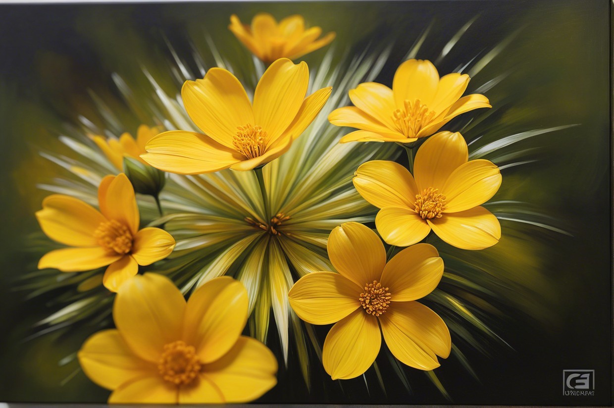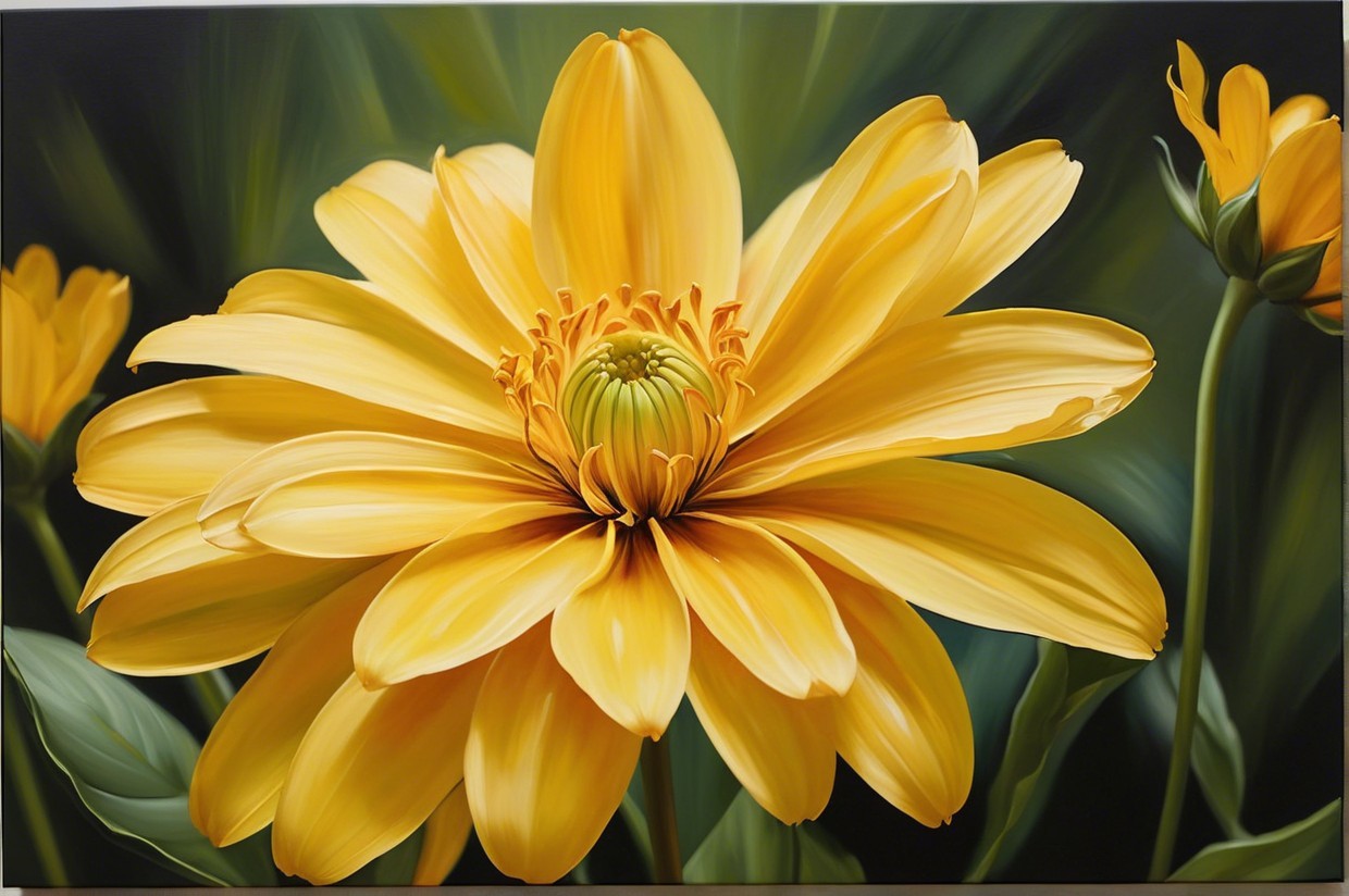 A vibrant painting featuring a large, blooming orange flower with yellow accents, surrounded by lush green leaves and delicate yellow buds. The artwork radiates warmth and energy.