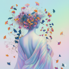 A striking female figure adorned with a vibrant butterfly-inspired headdress, surrounded by colorful flowers and butterflies, against a soft pastel background, exuding elegance and artistry.