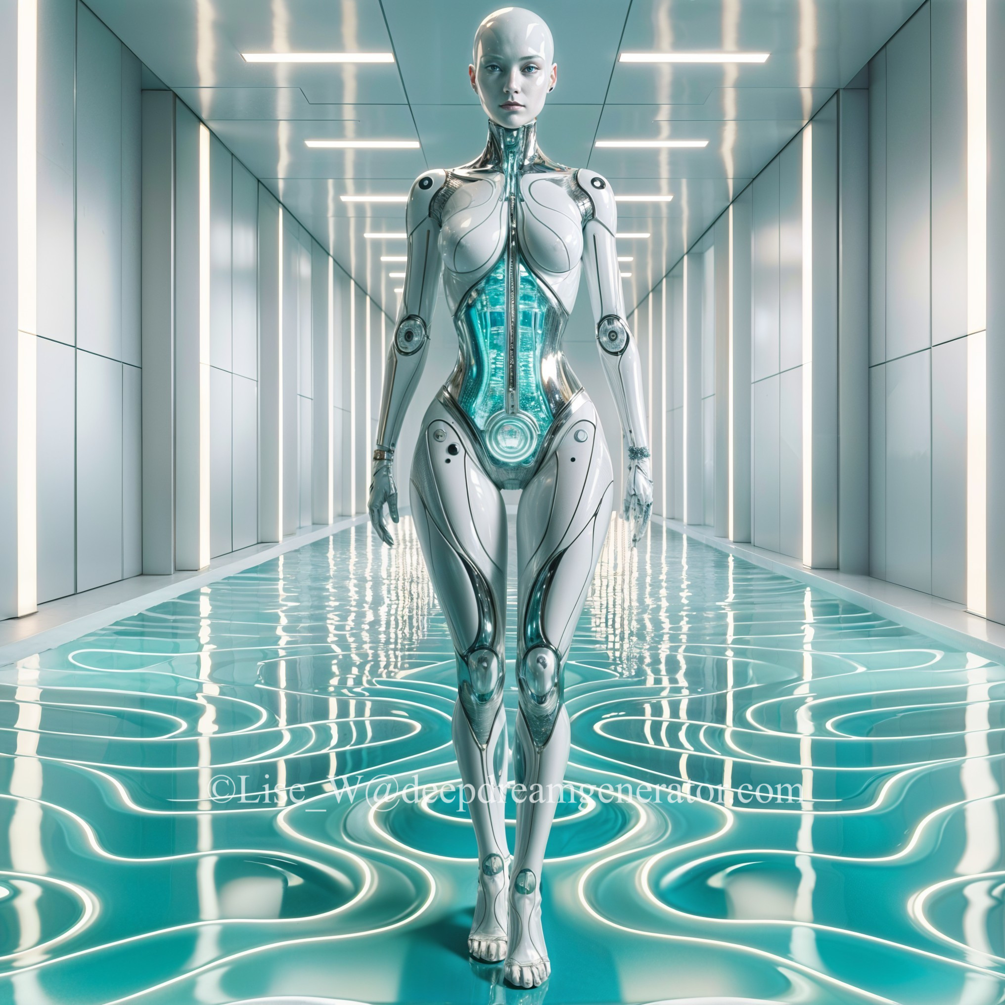 A futuristic humanoid robot stands in a sleek, metallic corridor with a glowing, turquoise floor. Its design features smooth curves and intricate details, emphasizing a blend of technology and beauty.