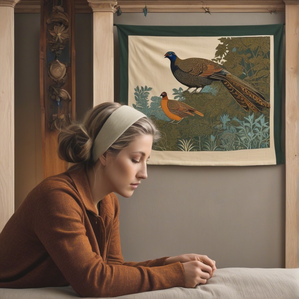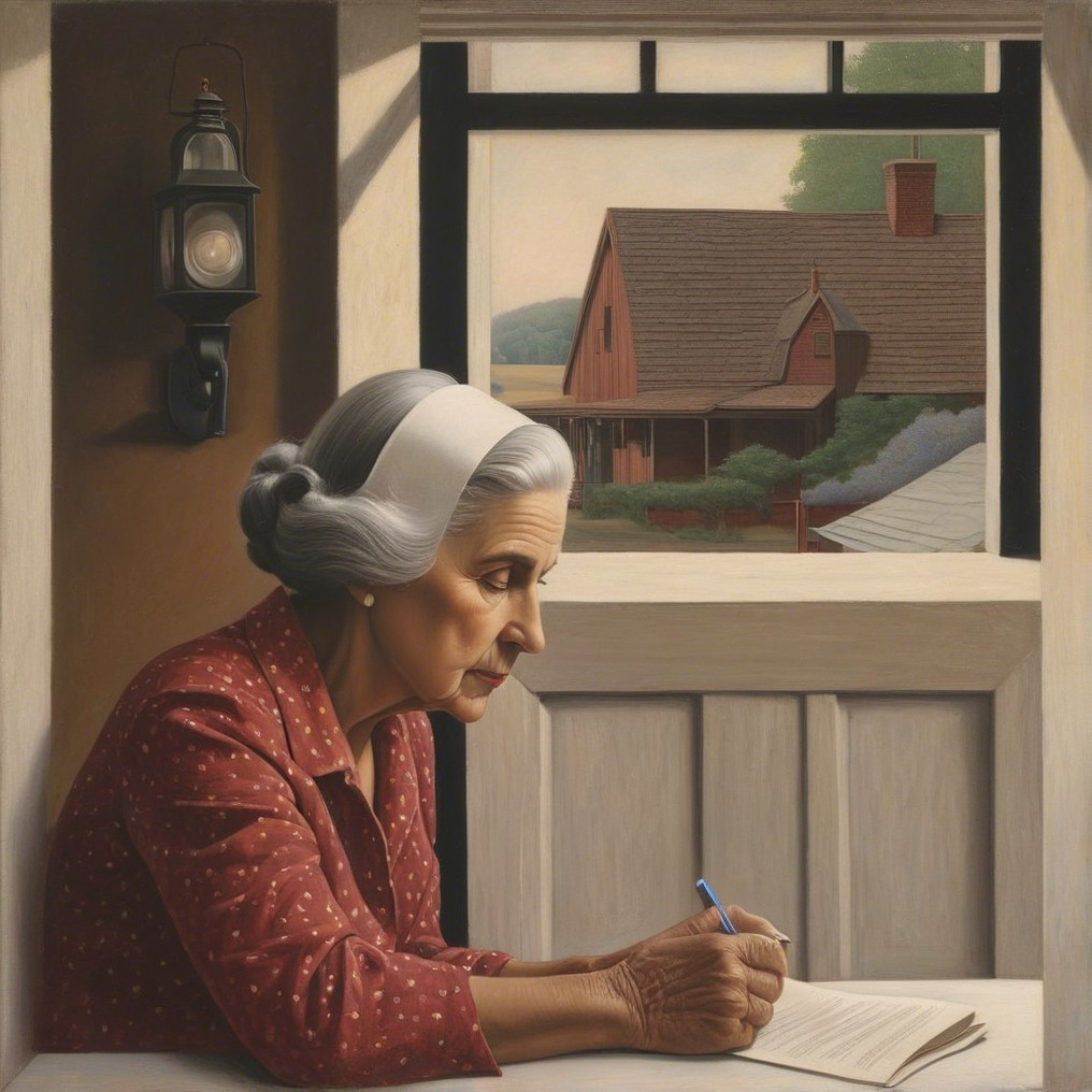 A contemplative man in a brown suit and hat sits at a table, thinking and gazing thoughtfully at a colorful painting of a vintage small town street scene with a red car and houses in the background.