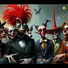 A surreal group portrait features six figures in eccentric attire with exaggerated hairstyles and makeup. Their expressions are intriguing, set against a colorful, abstract background.