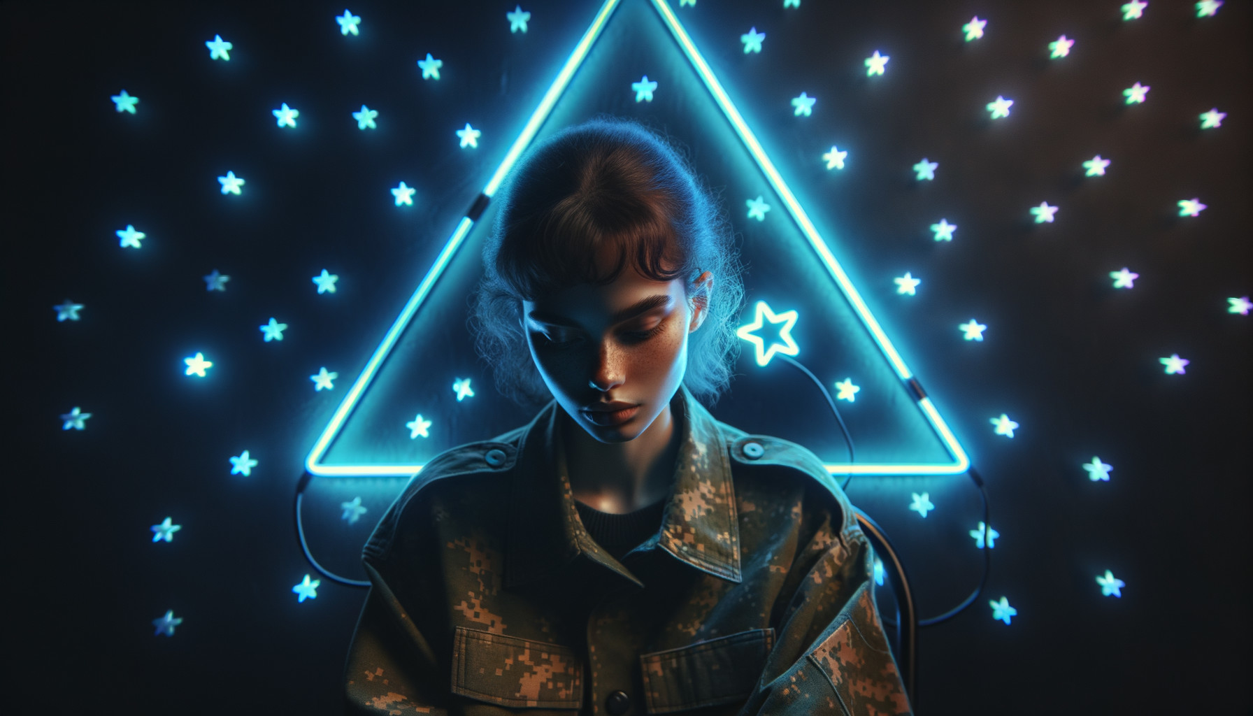 A young woman with a contemplative expression, wearing a camo jacket, stands before a glowing blue neon triangle and star shapes.