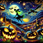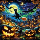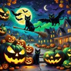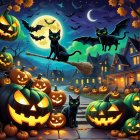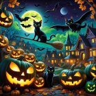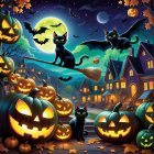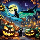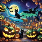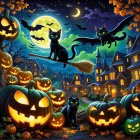 A whimsical Halloween scene with vibrant jack-o'-lanterns, two playful black cats on a broom and flying bat, set against a moonlit night with charming houses and glowing pumpkins.