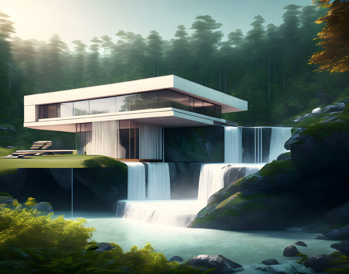 Prompt: "A modern rectangular home that is situated at the base of a waterfall. The home consists of one main rectangular section and two smaller rectangular sections, all connected seamlessly. The home should be rendered with sharp, photo-like quality.