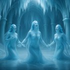 Three ethereal figures in flowing white gowns stand hand in hand inside a glacial cave, illuminated by soft blue light and surrounded by shimmering ice formations. A mystical atmosphere envelops them.