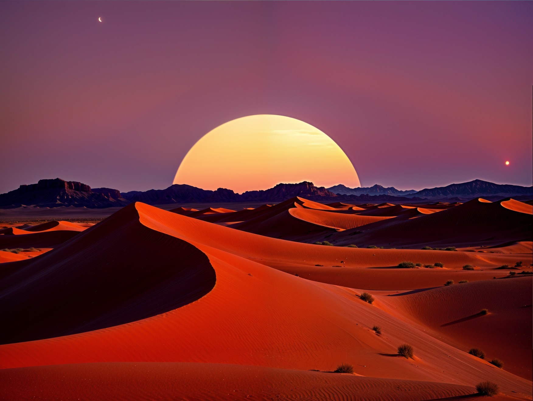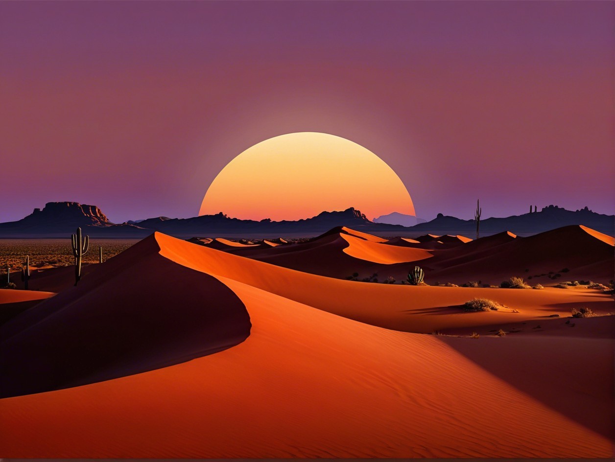 A stunning desert landscape at sunset, featuring vast sandy dunes illuminated by the warm glow of the setting sun. Silhouetted cacti and distant mountains enhance the serene beauty of the scene.